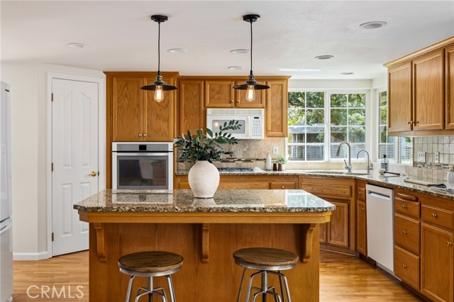 Step inside to find a welcoming entry that leads to a large formal living room and an inviting family room, complete with a cozy brick gas fireplace and pellet stove. The heart of the home—the kitchen—boasts a central island, granite countertops, a breakfast nook, wood floors, and a sliding glass door that opens to the backyard, creating seamless indoor-outdoor living. The expansive primary suite features an en suite bathroom and a generously sized walk-in closet, while two comfortable guest bedrooms and a full guest bathroom provide ample space for family or visitors. Additional conveniences include a laundry room and a half bathroom located in the deep 3-car garage.