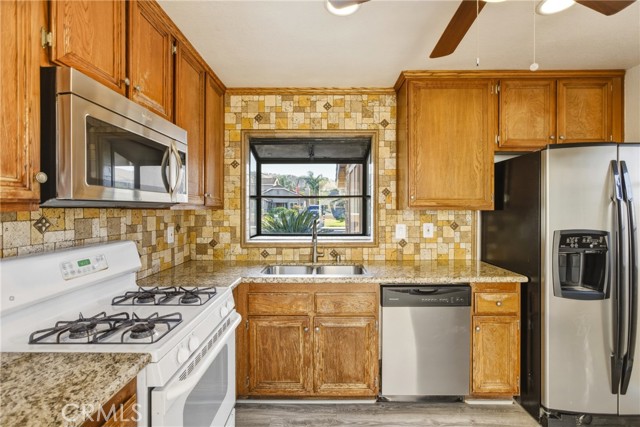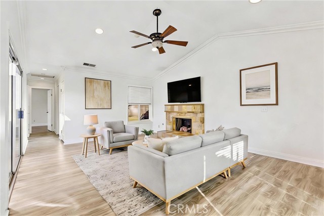 Step inside to find an abundance of natural light, fresh interior paint, and updated flooring throughout. The open living room with a cozy fireplace flows seamlessly into the dining area and spacious kitchen—perfect for entertaining. The kitchen offers ample space and features a convenient slider leading to your private backyard, ideal for relaxing or hosting gatherings.