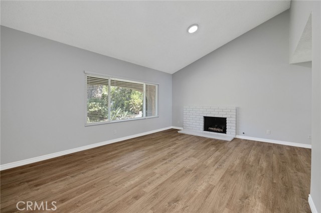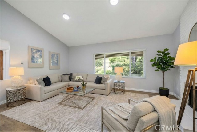 The formal living and dining room with a gas fireplace creates a welcoming space for gathering, while the remodeled stainless and Corian kitchen opens directly to the vaulted family room and out to the backyard through sliding glass doors.