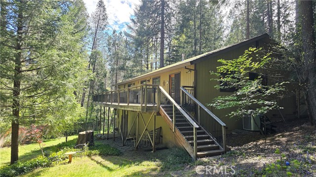 CREEKSIDE MOUNTAIN LIVING! Set alongside Middle Butte Creek, this property offers a tranquil setting with the soothing sounds of the babbling brook, a bricked patio with fire pit, shaded by towering pines—perfect for relaxing or entertaining. The fully usable property also features a side gate for easy backyard access and is easily maintained with full irrigation and drip systems. The property is also home to abundant year-round wildlife, including deer. In spring, the grounds come alive with vibrant blooms including azaleas, rhododendrons, periwinkle, columbine, foxgloves, dogwoods, and more. A large front deck and attractive tile entry welcome you into this inviting home, where the open living and dining areas feature gorgeous hardwood floors, a woodstove on a stone-accented hearth, and peaceful views of the private backyard. The kitchen is well-appointed with a newer refrigerator & double-ovens, a double-drawer dishwasher, attractive ceiling accents, and a breakfast bar that opens to the spacious dining area with French doors to the back deck—ideal for indoor-outdoor living. The primary suite offers both comfort and convenience, complete with a private door to the balcony-style back deck, a walk-in tile shower, large dressing and vanity area, and a double-door walk-in closet. Two additional guest bedrooms provide flexibility, with one featuring its own private balcony access and the other offering a large window with views of the flowering front yard. The hall bathroom offers ample vanity space, and a decedent jetted tub with a custom tile surround. Designed for efficiency and year-round comfort, the home includes a newer 5-ton American Standard energy-efficient heat and air system, a Lennox Healthy Climate media air cleaner, a heat exchange unit that distributes warmth from the fireplace to the bedrooms. The spacious game room has French doors to the outside, a pellet stove w/a river-rock hearth, plus a wall-mounted AC and attic fan. Additional highlights include an aggregate driveway with a large parking area and RV space. Beneath the home, a full workshop & storage area with a concrete patio entrance providing excellent functionality, along with a separate storage room on the lower south side. With multiple outdoor living spaces, ample indoor space, thoughtful upgrades, and a peaceful creek-side setting, this wooded mountain retreat offers a rare blend of natural beauty, functionality, and comfort all nestled at the end of a quiet cul-de-sac.