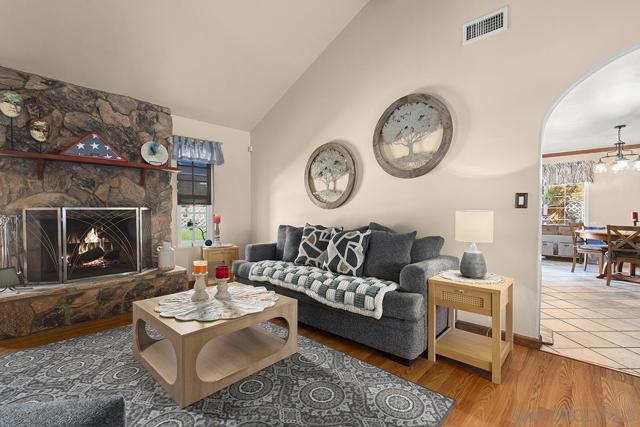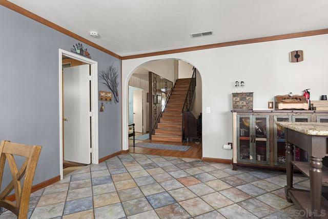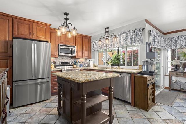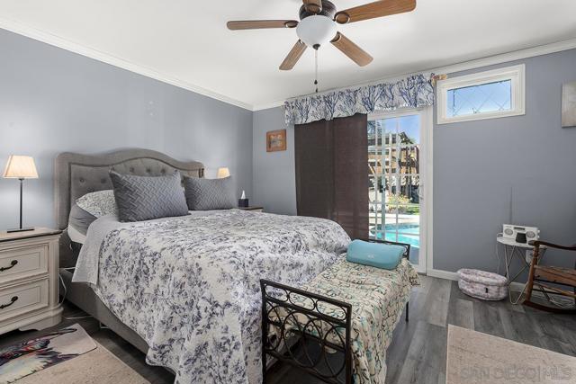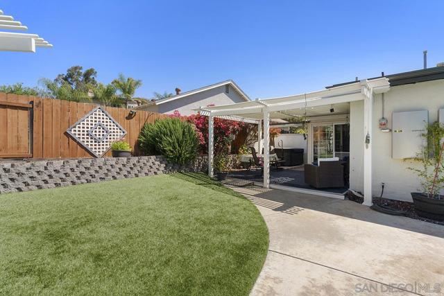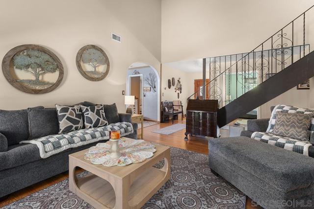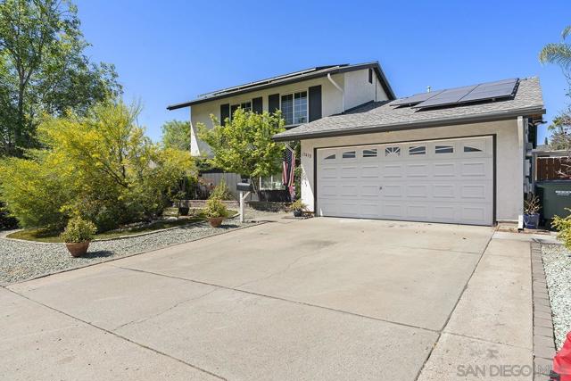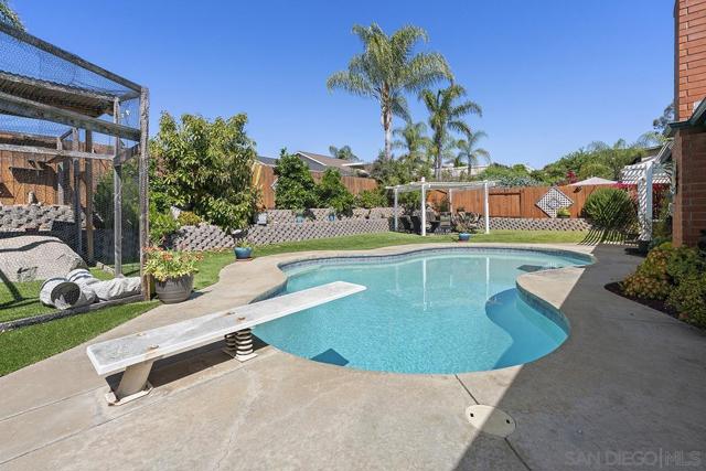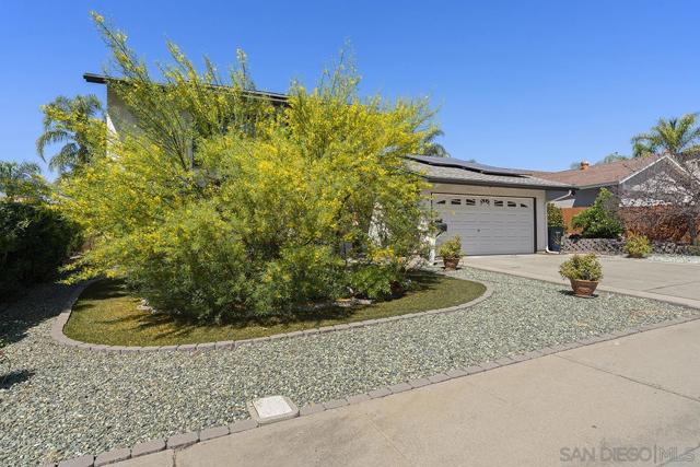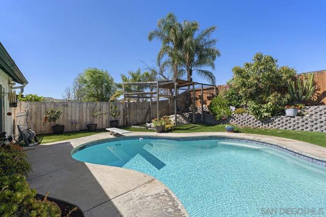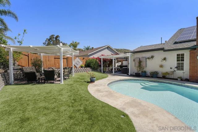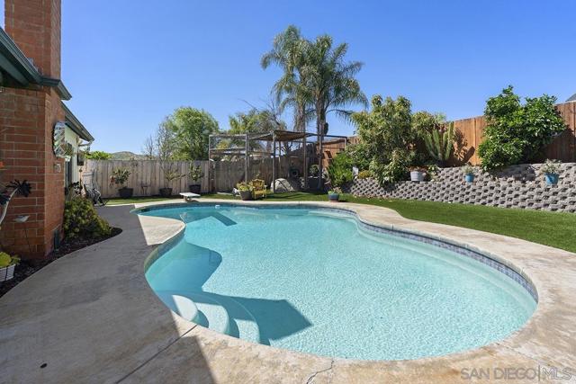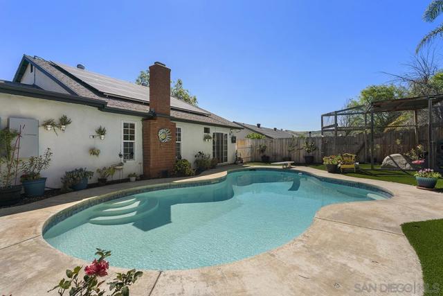 4 bedrooms and a full 3 baths. Quiet street. Move in ready home with a pool and an above ground spa. Two rooms could be primary. One downstairs and one large one upstairs (this was 2 rooms when it was built, now one large mster bedroom, the only room upstairs). Huge vaulted ceilings in the living room give this is grand feel. 49 solar panels and a new solar battery system. see attached. Recent SDGE bill was 23.00. Floor plan is in the pictures. Garage door is still on the front of this garage. Garage is partially converted to a family room. This is the room with the large TV in the pics. This is not permitted. This garage conversion is not part of the square footed listed in MLS. Garage has a few feet deep of storage. New owner could opt to remove one wall and turn this back into a garage.