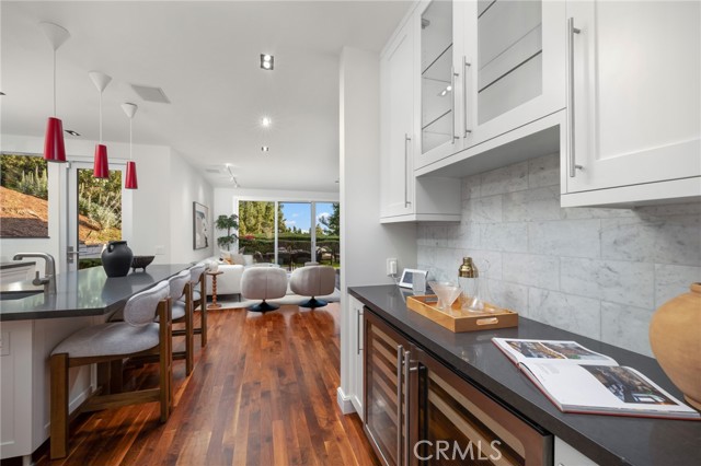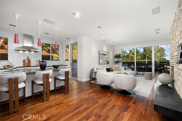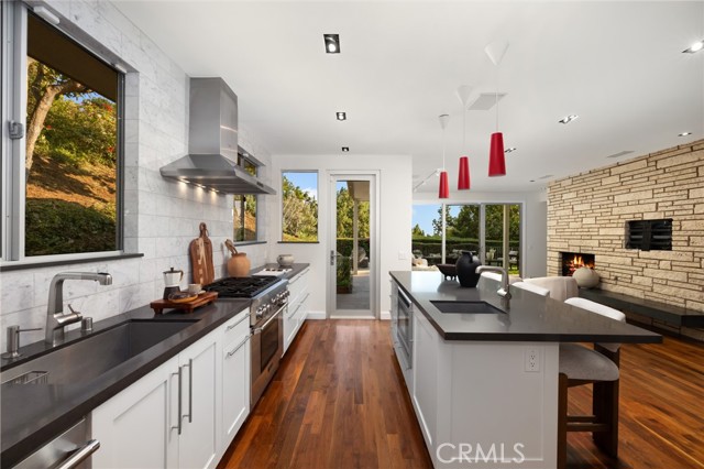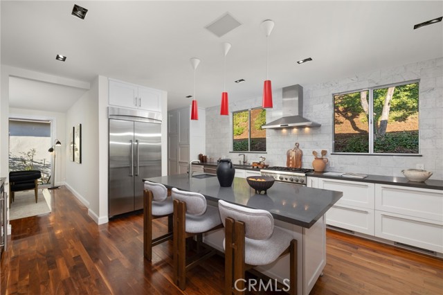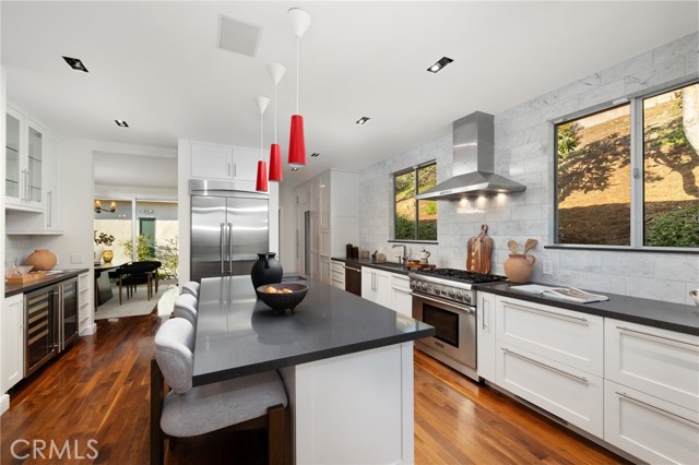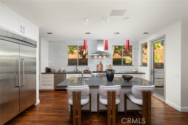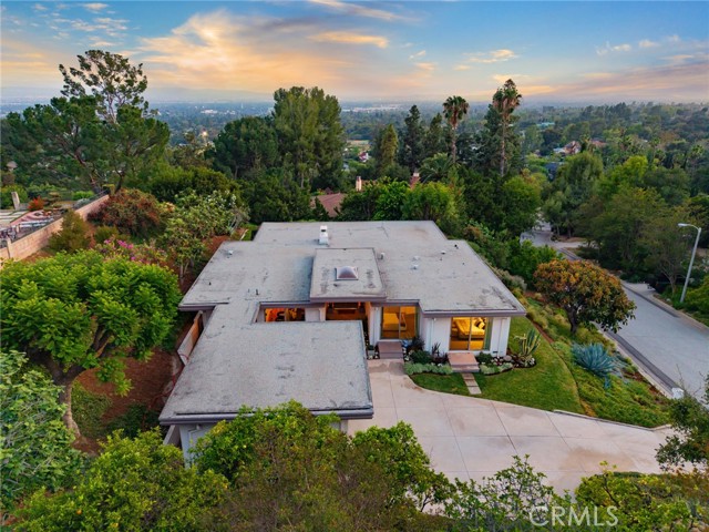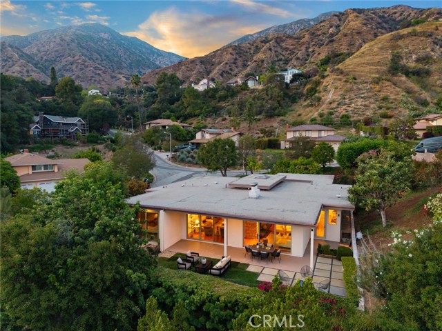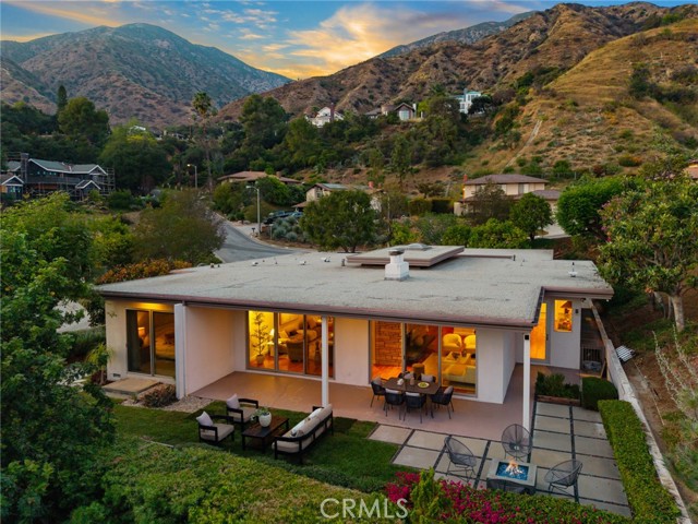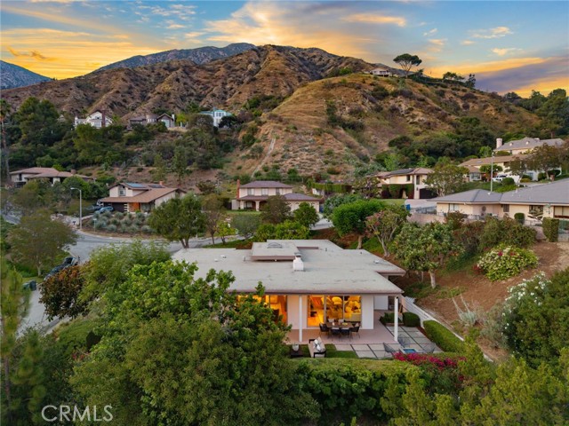 Set against the serene foothills of Sierra Madre, this striking contemporary residence captures sweeping mountain views and a refined sense of modern living. A dramatic double door entry welcomes you into a light-filled interior where expansive windows and clean architectural lines create an effortless connection between indoors and out. Designed for both everyday comfort and elevated entertaining, the home offers beautifully proportioned living spaces, including a warm and inviting family room with a fireplace, a sophisticated dining room, and a separate living area that feels both open and intimate. Natural light pours through large windows, enhancing the home’s airy ambiance and highlighting its thoughtful design. The recently remodeled kitchen with caesar stone counter tops, is both functional and visually compelling, appointed with custom cabinetry crafted by Expressions in Wood, featuring oversized drawers and convenient slide-out shelving. A full suite of premium Thermador stainless steel appliances, including a built-in refrigerator, gas range, microwave, dishwasher, and range hood anchors the space, while a Sub-Zero wine refrigerator adds a touch of luxury for entertaining. The adjacent powder room was also tastefully remodeled in 2019, further enhancing the home’s modern appeal. Private bedroom suites provide peaceful retreats, each thoughtfully designed for comfort and privacy. The primary suite serves as a calming escape, featuring a spa-inspired bathroom, a spacious walk-in closet, and oversized windows that frame the surrounding natural beauty. Extensive system upgrades add both value and peace of mind, including a completely updated HVAC system with new A/C, heating, and ducting. All original sliding doors were replaced with high-quality Jeld-Wen doors, enhancing both energy efficiency and aesthetics. Additional highlights include rich wood flooring, updated bathrooms, refined lighting, and a detached two-car garage. Outdoors, the setting unfolds into a tranquil backdrop for relaxation and entertaining. Whether enjoying a quiet morning on the patio or dining beneath the open sky, the natural surroundings create a true sense of retreat. Located in the highly desirable community of Sierra Madre, this home offers a rare balance of peaceful living with close proximity to charming local shops, dining, and scenic hiking trails, delivering the very best of foothill living.