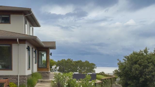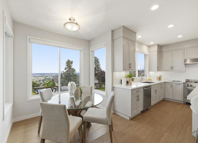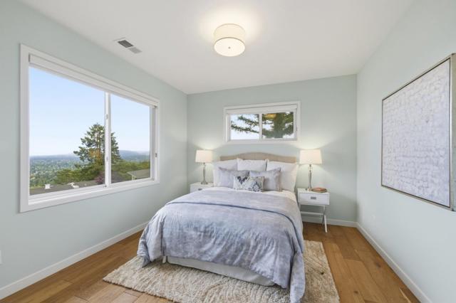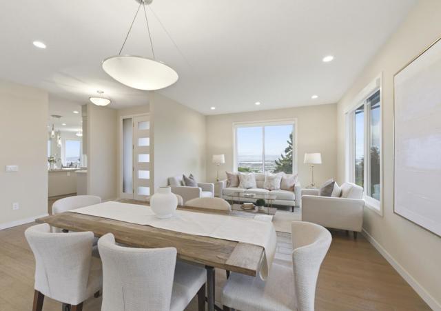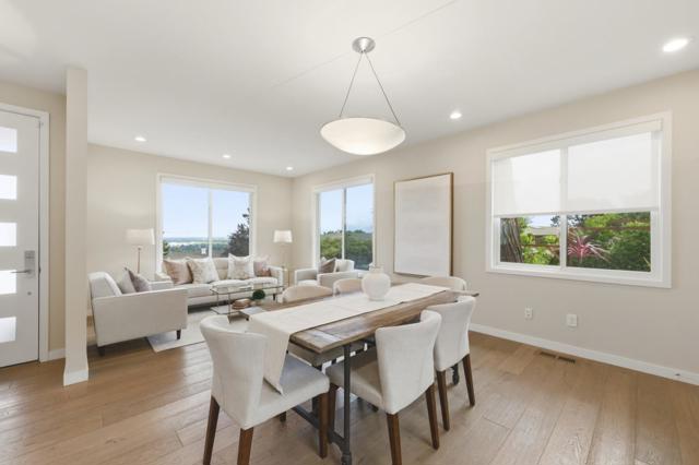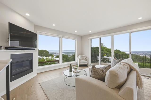 Beautifully situated, this home boasts incredible views of the Peninsula and Bay from expansive windows on both levels including the inviting front porch. Fine finishes are found throughout, including the open kitchen/family room with its high ceilings, gorgeous stone countertops and island with dramatic pendant lighting, and high-end stainless appliances. The upstairs primary suite provides more spectacular views, privacy, and a luxurious bath. The spacious yard is a gardeners delight with ample lawn area, retaining walls for flowering shrubs and plants, and several fruit trees. This delightful remodeled and expanded home beckons you to stay and enjoy the view - day or night!