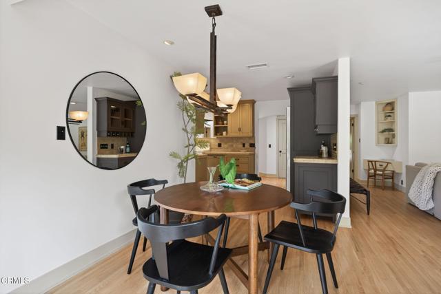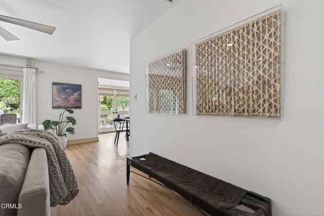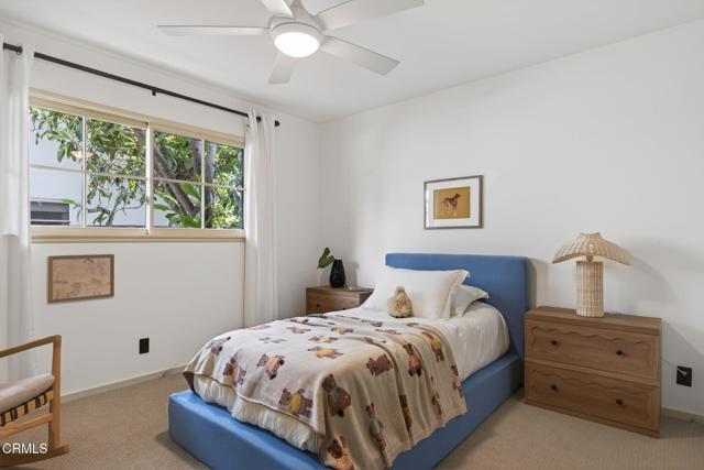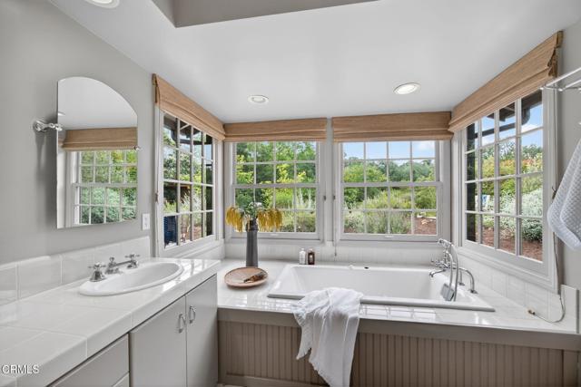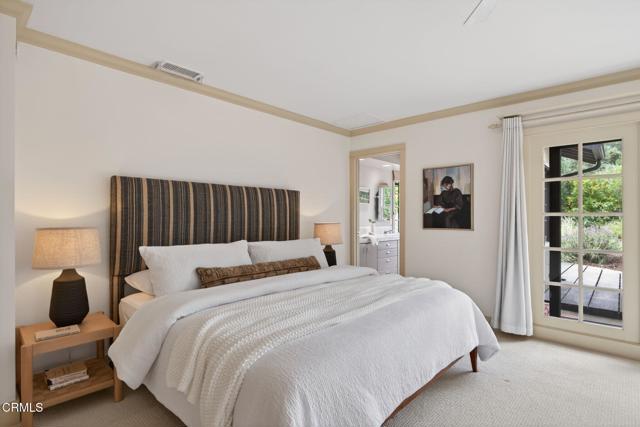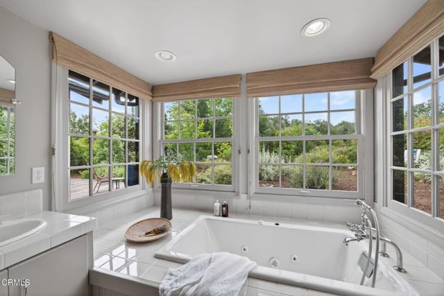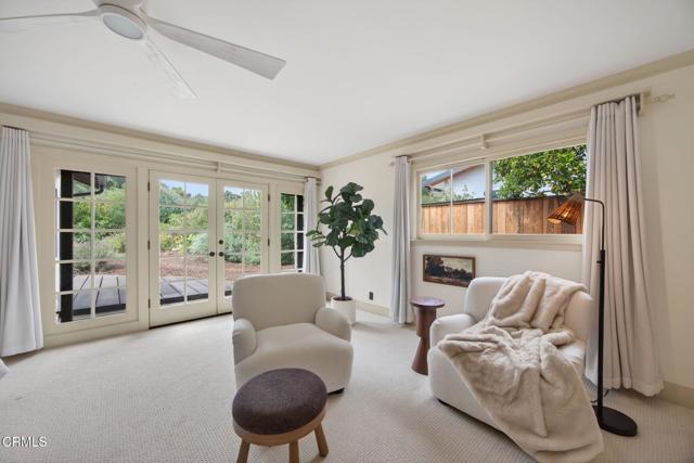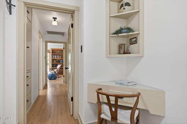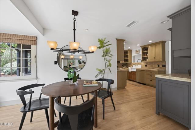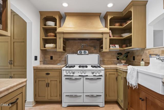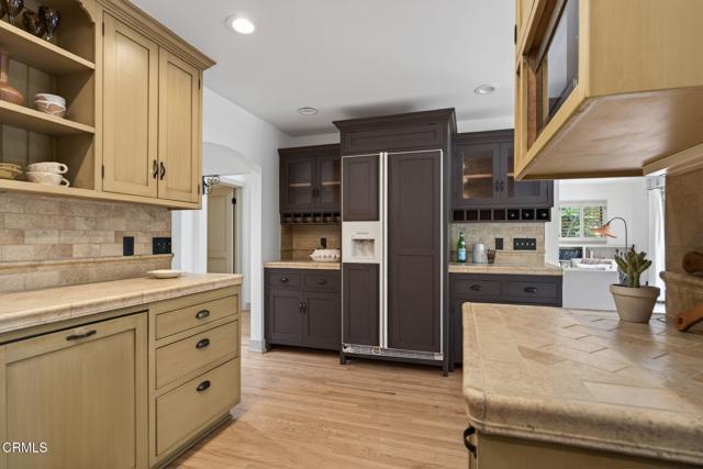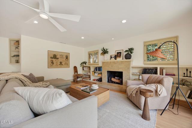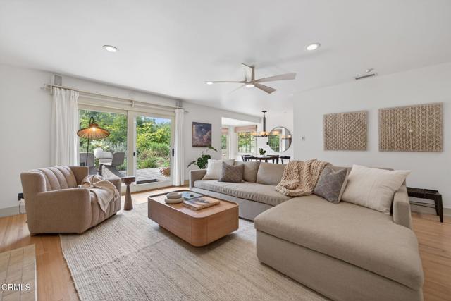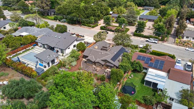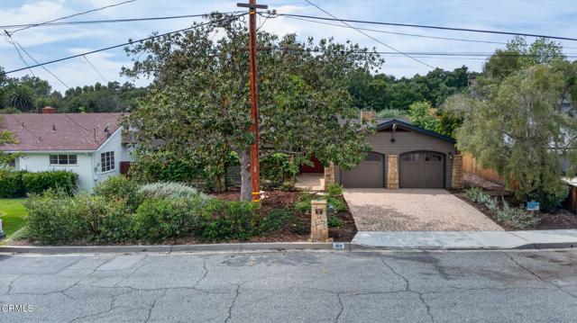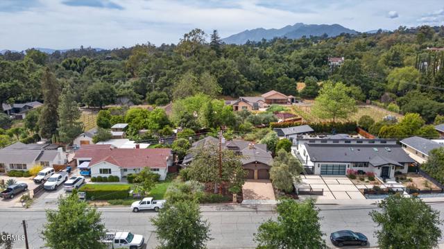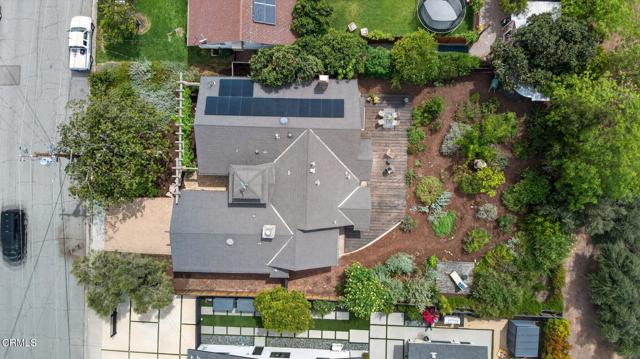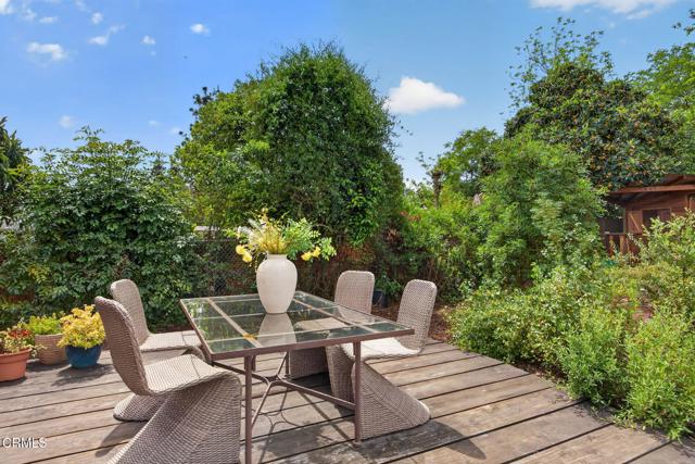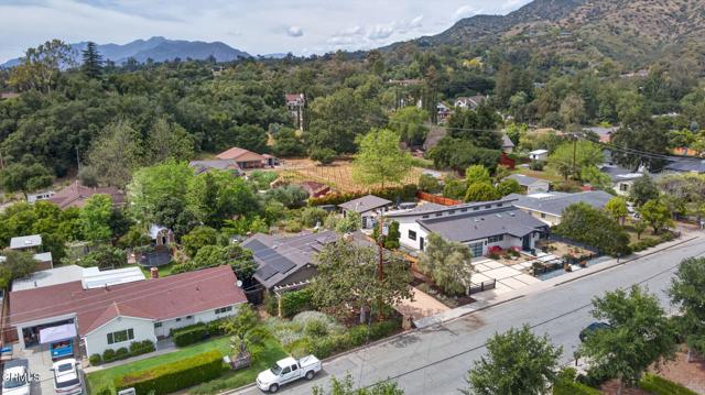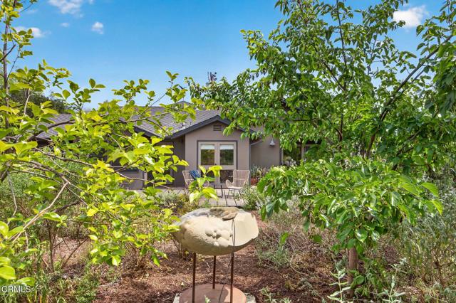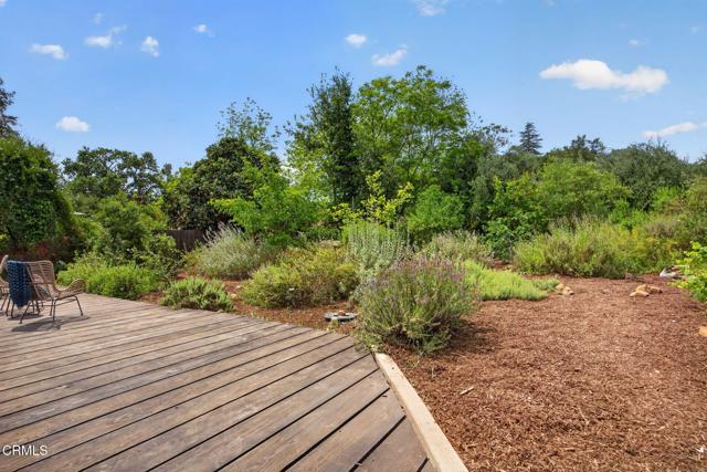 Thoughtfully designed single-level Arts and Crafts home with 2,110 sq ft, 3 bedrooms plus office, 2 baths, and a two-car garage. Warm wood floors, abundant natural light, and a functional layout with two bedrooms and an office on one wing and a private primary suite on the other. The primary suite features a fireplace, walk-in closet, French doors to a private patio, and an ensuite bath with soaking tub and separate shower.The kitchen is a true Craftsman expression, centered around an authentic vintage stove and complemented by ornate cabinetry, rich tilework, a dedicated workstation, and pantry area. Formal dining overlooks the backyard, while the living room offers built-in bookshelves, a fireplace, and sliding doors that open to the deck with mountain views.The 10,454 sq ft lot is thoughtfully designed as a curated native plant garden, featured in the 2024 Re-Wild Ojai Native Garden Tour, with meandering pathways and a variety of edible plantings including elderberry, currant, wild grape, chia, pomegranate, black fig, mulberry, persimmon, olive, and blackberry. A custom-built tool shed designed as an art piece and a sculptural stone water feature enhance the property's unique character. Additional features include owned solar and French doors in the office and one guest bedroom. A rare blend of location, design, and natural beauty in the heart of Ojai.