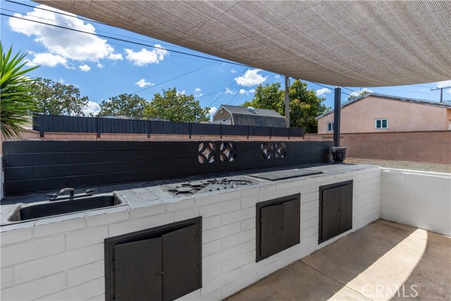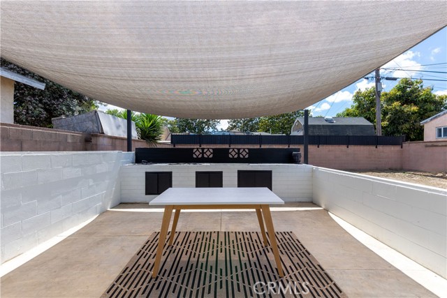 The exterior makes a striking statement with a bold, high-contrast aesthetic, featuring crisp white stucco accented by deep charcoal masonry and architectural lighting. The experience continues in the backyard oasis, which boasts a custom masonry outdoor kitchen and a sun-drenched patio under an architectural shade—perfect for alfresco dining and California summer nights.