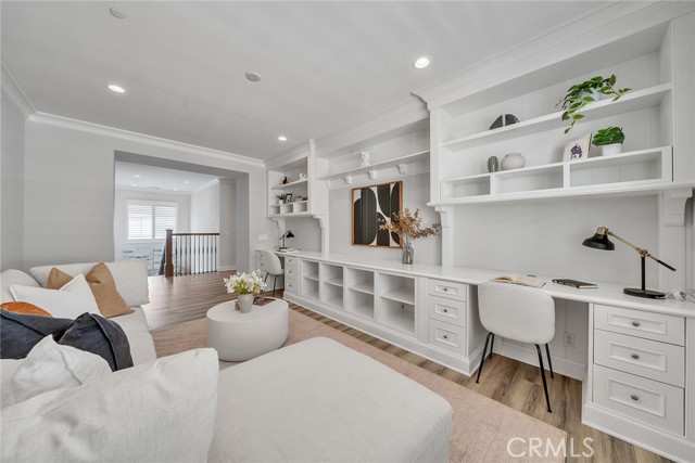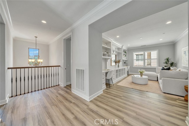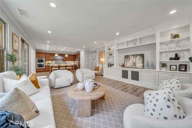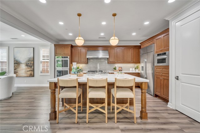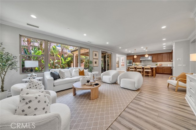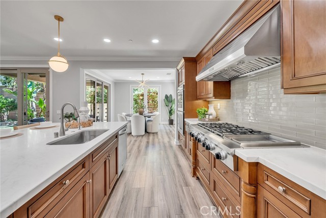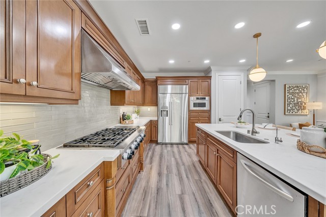 Welcome to 80 Rossmore — a beautifully upgraded 4-bedroom, 4-bathroom home with a spacious loft, nestled in Irvine's prestigious Stonegate community. The expansive open-concept floor plan is designed for both comfortable everyday living and effortless entertaining. The gourmet kitchen is a true showstopper, featuring wood recess-panel cabinetry, granite countertops with a designer backsplash, a professional 6-burner gas cooktop with griddle, elegant pendant lighting, and a generous walk-in pantry. It flows seamlessly into the dining room and great room — anchored by a cozy gas fireplace — and extends out to the bright California room and a delightful backyard perfect for gatherings or quiet relaxation.