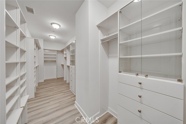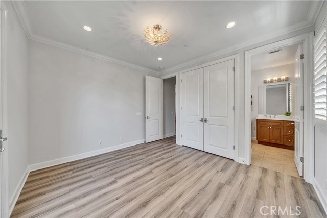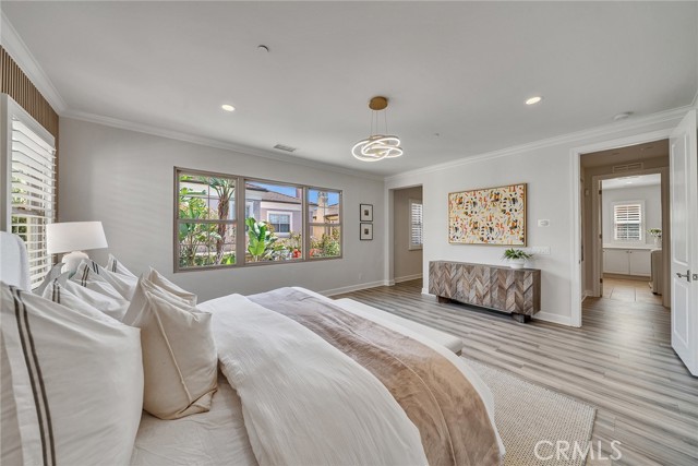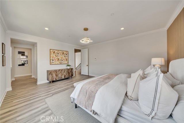 A main-level bedroom and full bath provide ideal accommodations for guests or multi-generational living. Upstairs, brand-new luxury laminate flooring sets a fresh tone throughout. A versatile loft offers endless possibilities as a media room, office, or play space. Two additional en-suite bedrooms ensure privacy and comfort, while the expansive primary suite impresses with dual quartz vanities, a glass-enclosed shower, soaking tub, and a custom walk-in closet with built-in cabinetry. Both the downstairs bedroom and primary suite have been thoughtfully remodeled with designer wood slat accent walls, adding warmth and architectural character to each space.