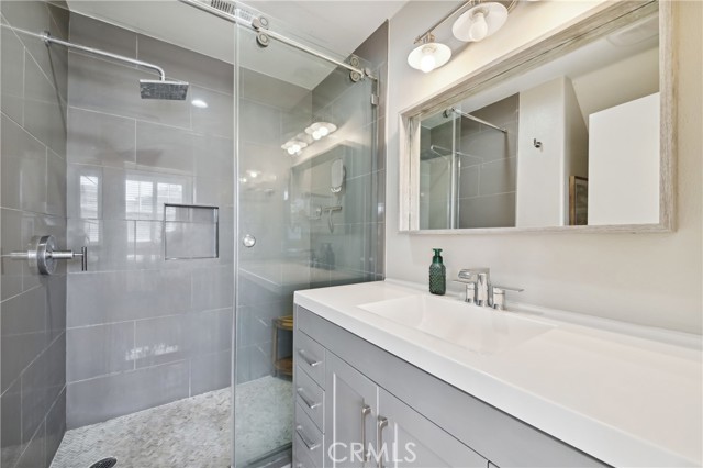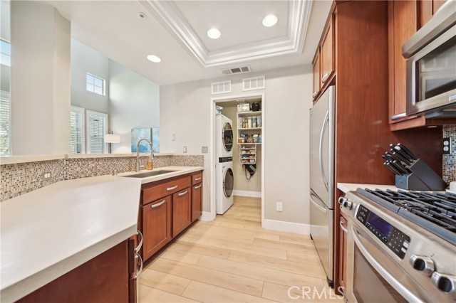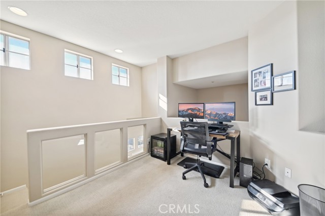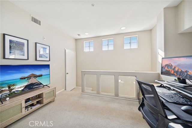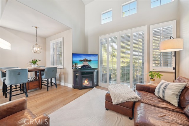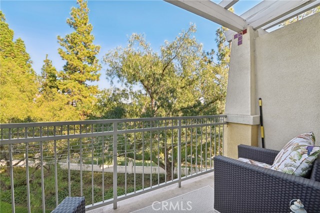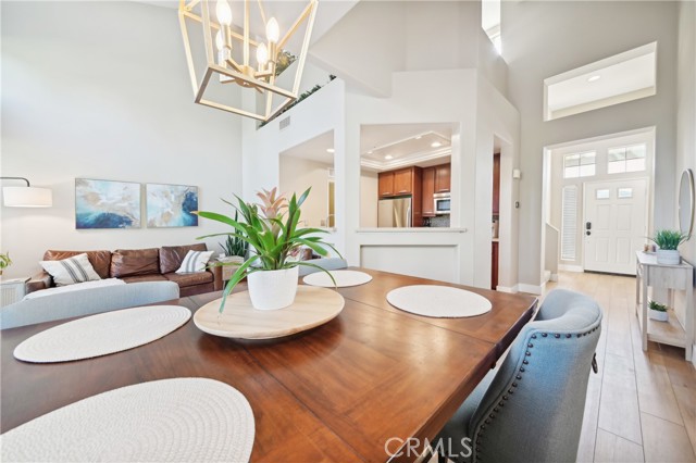 Welcome to the Vistas community in picturesque Aliso Viejo! This exquisite third-level penthouse condo features a generous living space, comprised of one bedroom plus a loft/office and a bathroom. The bathroom has been recently updated, showcasing a spacious walk-in shower, a new vanity, and elegant countertops. The open floor plan, complemented by soaring vaulted ceilings, ensures an abundance of natural light fills every room. Enjoy the serene tree-top views from your private patio. The kitchen, tastefully modernized, is equipped with stainless steel appliances and quartz countertops, making it a delight for cooking. A laundry room with a brand-new LG washer and dryer is conveniently situated on the main floor. Recently installed beautiful white Oak Coretec luxury vinyl plank flooring enhances the main level. The loft upstairs serves as an ideal home office space or guest bedroom. Additionally, there is a detached one-car garage featuring a new Chamberlain garage door opener with a quiet belt, along with one assigned parking space. A new water heater and an energy-efficient HVAC system were installed in 2024. The community is conveniently located near the famous Top of the World hiking and biking trails, Canyon View Park, shopping, dining, and entertainment. It also offers a pool, spa and gym for residents enjoyment. Don’t miss out on this remarkable property; it won’t be available for long!
