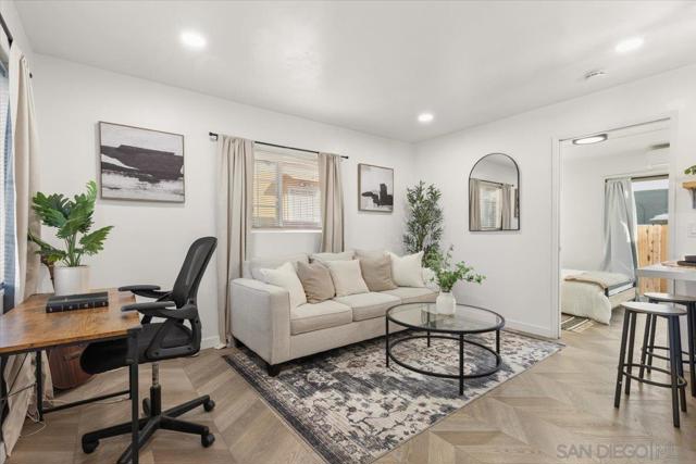 Charming, Private & Move-in ready! This private 1BD/1BA home is a rare find! Featuring modern chevron-pattern flooring, recessed lighting, and a sleek kitchen with stainless steel appliances and new cabinetry. The spa-like bathroom boasts floor-to-ceiling tile and Moroccan-pattern flooring. Enjoy your covered deck with included washer/dryer, plus upgrades like a new roof, windows, stucco, and driveway. Tucked away on a private lane near Kimball Park, schools, and shopping. Turnkey and ready to go!