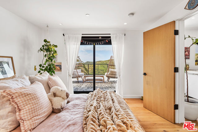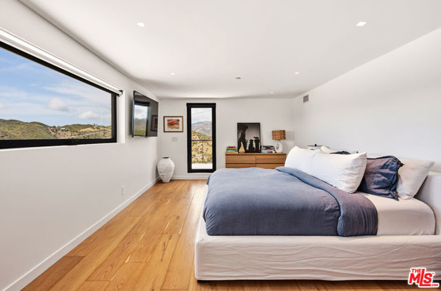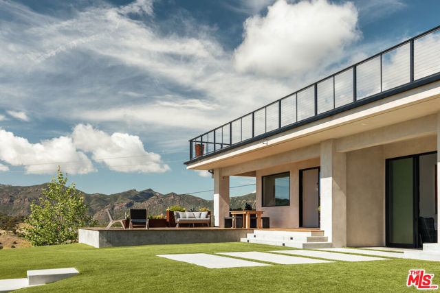 Design-forward mountain retreat with sweeping ocean-to-mountain views. Set on approximately 2 acres in the Santa Monica Mountains near Malibu's County Line, this modern residence offers privacy with easy access to iconic surf breaks and trailheads. Rebuilt in 2023, the approximately 3,200 sq. ft. home - designed by architect Sara Laws with interiors by Malibu Market & Design - pairs clean architectural lines with natural warmth and resilient construction. The home features 4 bedrooms and 4.5 bathrooms across two levels, with flexible en-suite layouts and seamless indoor-outdoor flow. Expansive Fleetwood steel doors and windows open the residence to its surrounding landscape, while oak hardwood floors, 10-foot ceilings, and a Lutron lighting and shade system create a cohesive, refined interior. The kitchen is both functional and elevated, appointed with custom Italian cabinetry, Dekton stone surfaces, an eat-in island, and a full suite of Thermador appliances. Outdoor living unfolds across Garapa hardwood decks with a cedar hot tub, gas fire pit, and mini putting green, along with a detached office/studio featuring an outdoor shower. The approximately 1,400 sq. ft. upper deck offers a commanding vantage point over the surrounding landscape. The home is supported by modern systems and infrastructure, including Sonos wiring, Starlink connectivity, an integrated security system, fire-resistant construction, upgraded water systems, solar backup batteries, and drought-tolerant landscaping. A rare balance of design, privacy, and setting in one of Malibu's most naturally connected environments.
