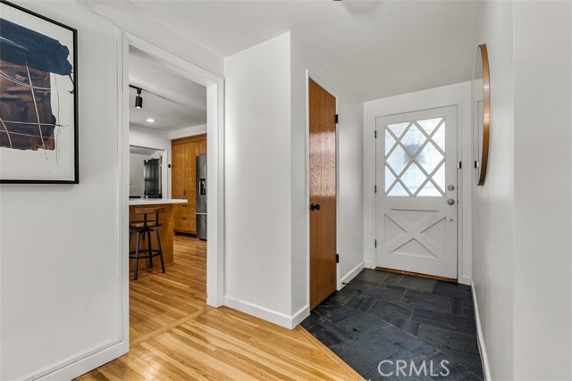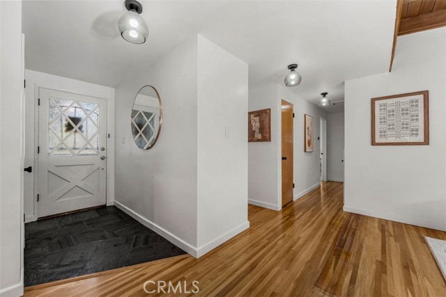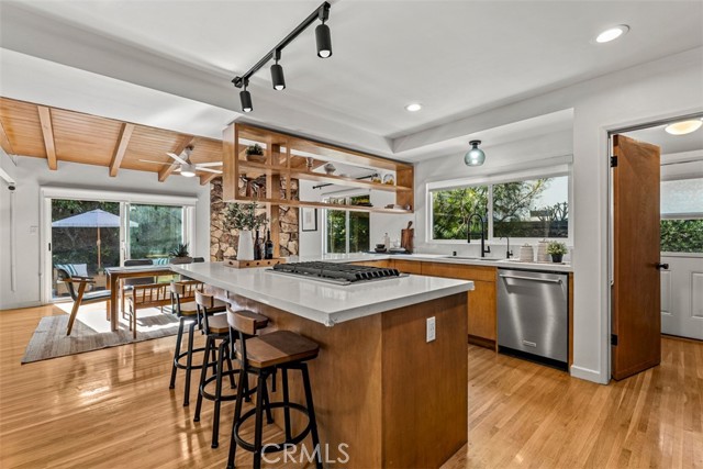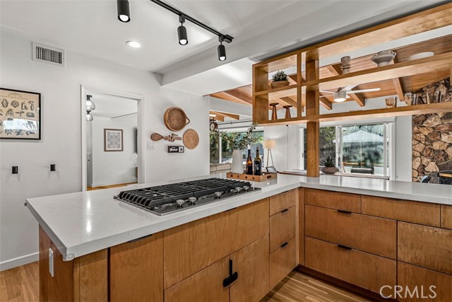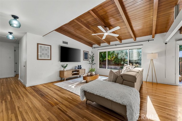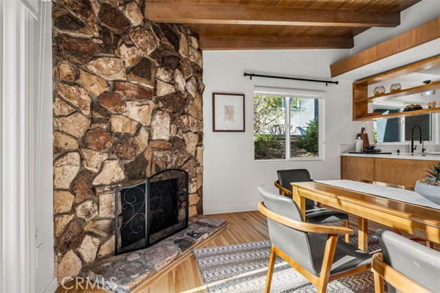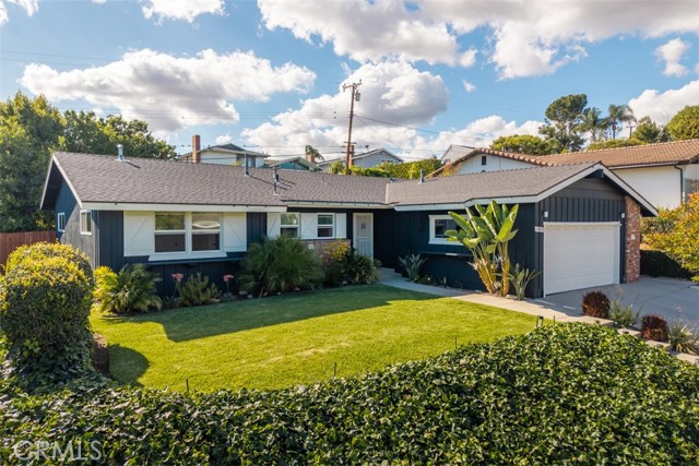 Discover a single-level Craftsman home with Mid-Century Modern influence offering a balanced combination of original architecture and thoughtful contemporary updates, ideal for buyers seeking the comfort and ease of living in a quiet neighborhood. Built with solid craftsmanship, the home retains key architectural features beginning with exposed wood beams & original stacked stone fireplace juxtaposed to the remodeled dining and kitchen space. These elements are complemented by a modern kitchen featuring open shelving and flat-panel walnut cabinetry, sleek and polished quartz countertops, creating a clean and functional layout that highlights the home’s structure without excess detail. Throughout the residence, updated orb colored-glass pendant lighting and matte black hardware provide a pop and visual consistency. Hallways are accented with globe pendant lighting, black door knobs that matches the kitchen drawer pulls. Bathrooms are finished with vertical subway tile, matte black silhouette mirrors, and beveled glass shower enclosures, creating aesthetic continuity across the home. Slim wall light sconces flank mirrors for functionality and modern contrast. Recent upgrades include new double pane, energy efficient windows with light-filtering and privacy blinds, paired with simple white ceiling fans. Refinished original wood flooring extends throughout the home, reinforcing its single-level flow. Additional improvements include a tankless water heater, fresh interior paint and water softener offering a move-in-ready opportunity. The HVAC system and the roof are a little over 5 years old. The outdoor space is designed for low-maintenance living, with grass and concrete areas complemented by fruit trees and ornamental plantings, enhancing curb appeal while providing usable backyard space. This property presents a rare opportunity to own a well-updated, single-story home with architectural character in a peaceful residential setting.