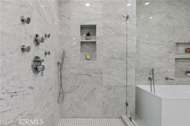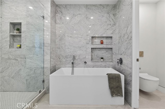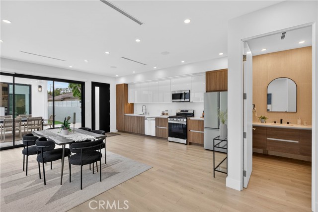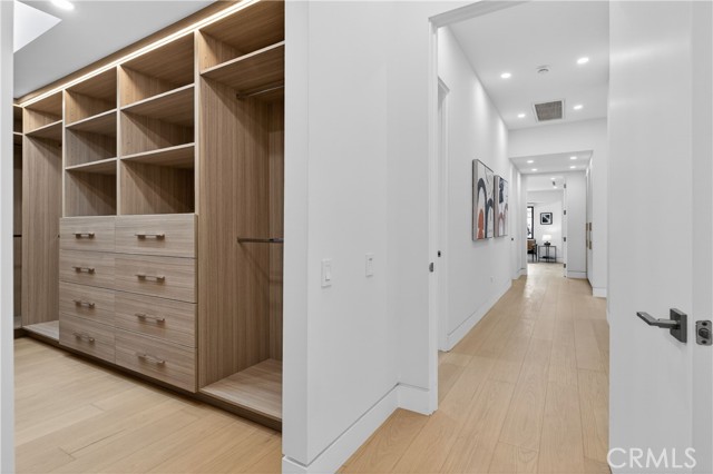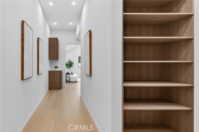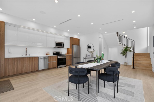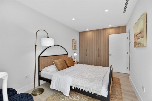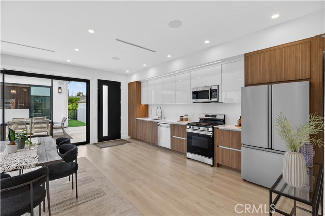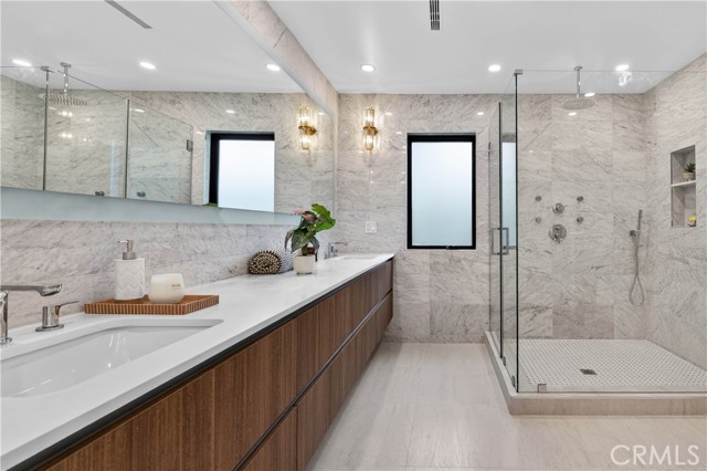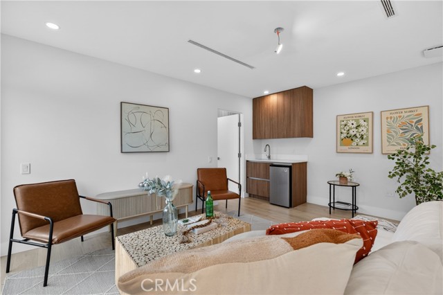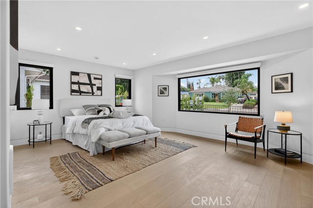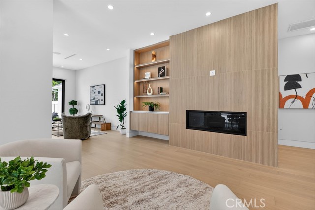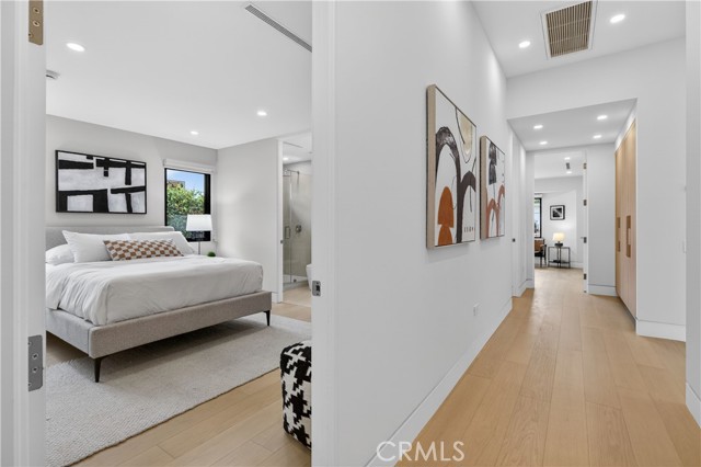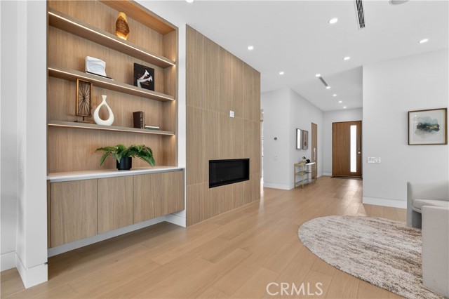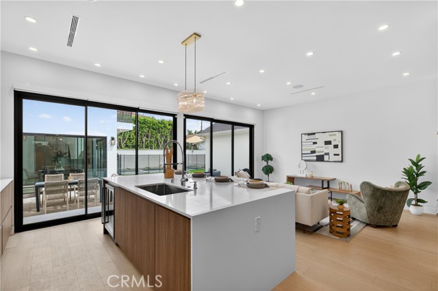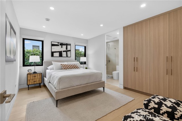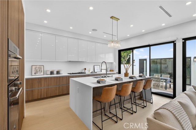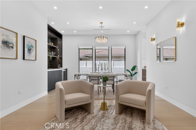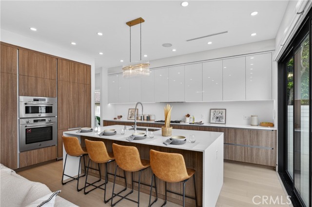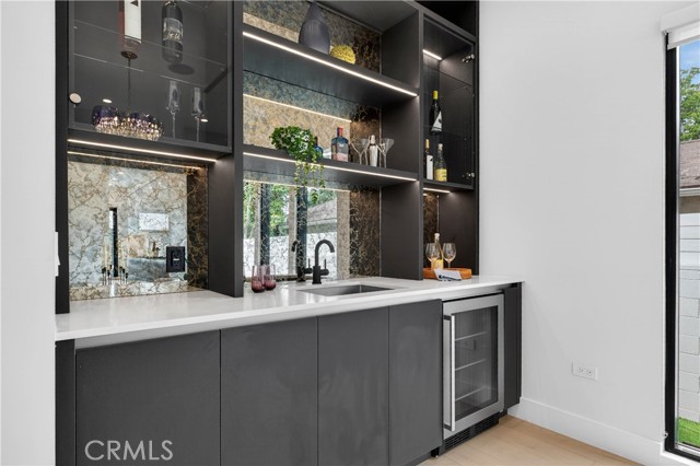 The chef’s kitchen is appointed with premium Bertazzoni appliances, bespoke cabinetry, curated designer finishes, and a built-in beverage center. The primary suite offers a private retreat with a vaulted ceiling, spa-caliber bath, custom walk-in wardrobe, and an integrated beverage station with sink and cooler.
