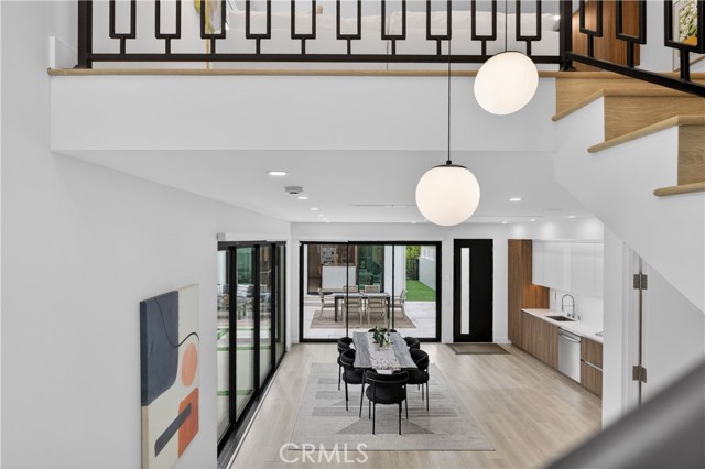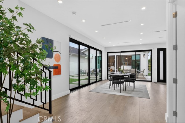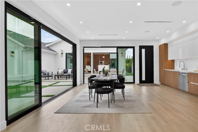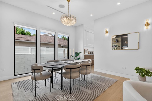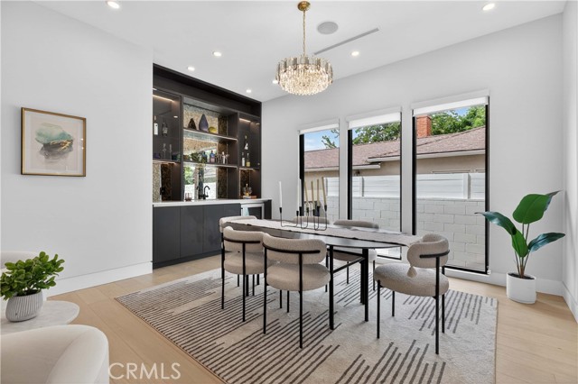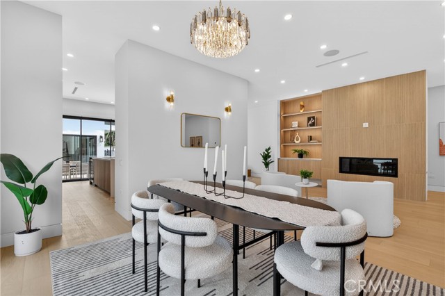 Designed with scale and natural light in mind, the interiors are defined by soaring 10-foot ceilings and expansive floor-to-ceiling sliding glass doors, creating a seamless indoor-outdoor experience ideal for both entertaining and everyday living. A formal dining salon serves as a striking entertaining space, anchored by a fireplace and complemented by a wet bar.