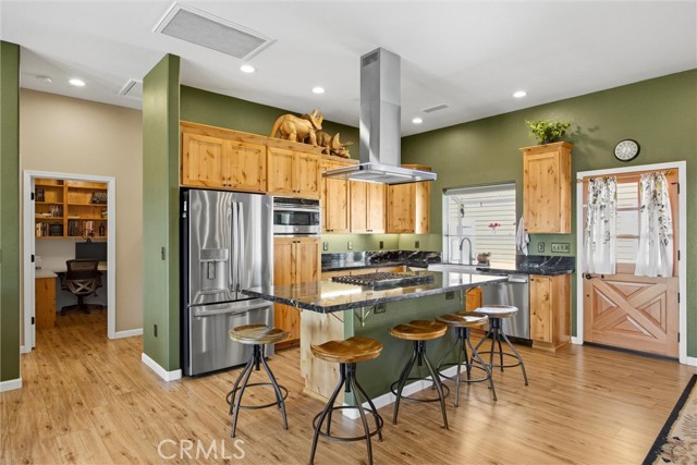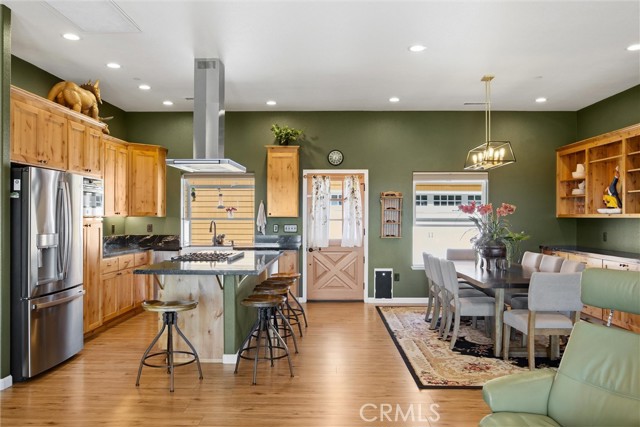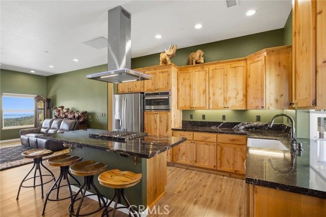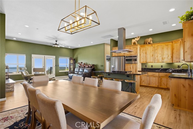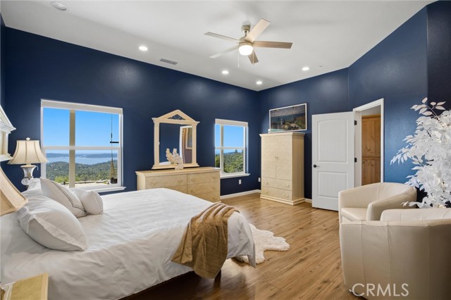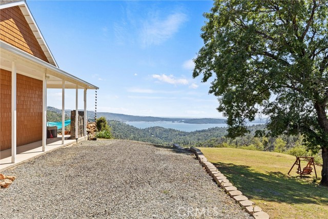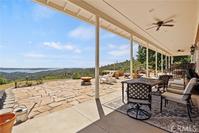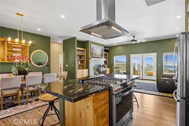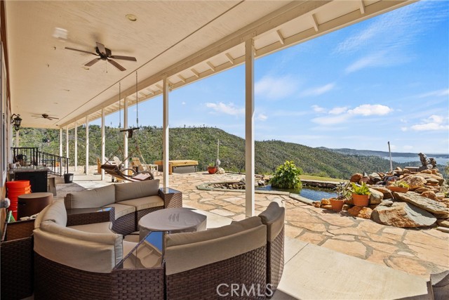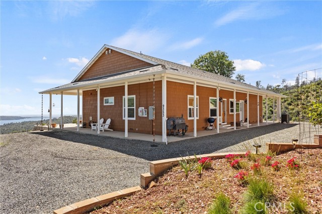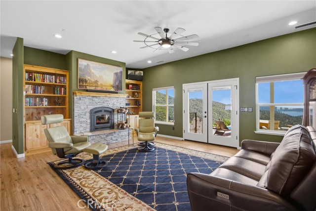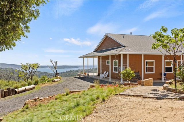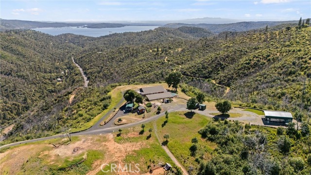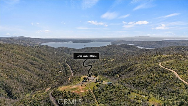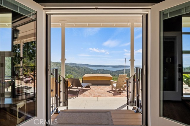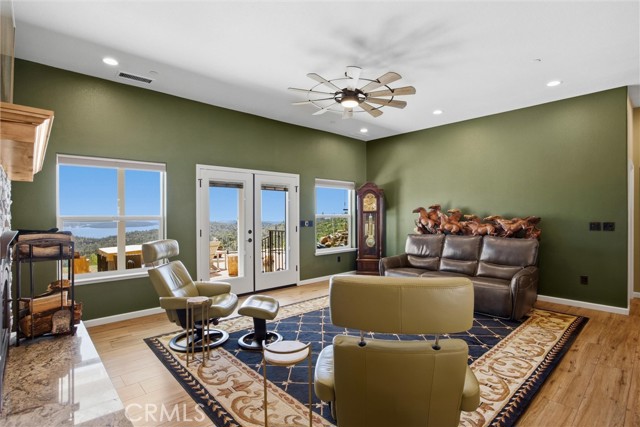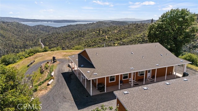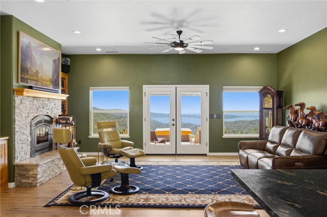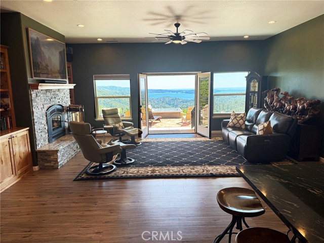 The large black iron electric gate is the gateway to your private driveway, which leads to a secluded hilltop with the most stellar views. In the middle of these 40 acres, you will find a beautiful custom-built home with an open floor plan & large windows that frame captivating views of the hills, lake, & marina. There is custom small-knotty-alder-wood cabinetry throughout, 10-foot ceilings, 2X6 construction, & double insulation. GREAT ROOM includes the FAMILY ROOM with an inviting wood-burning fireplace, DINING ROOM, & a KITCHEN with an island & a sit-up bar. Thru the glass French door, you can access the front patio, fish pond, & hot tub area.