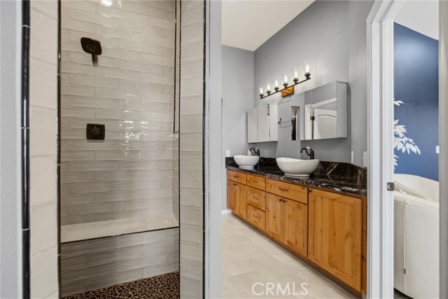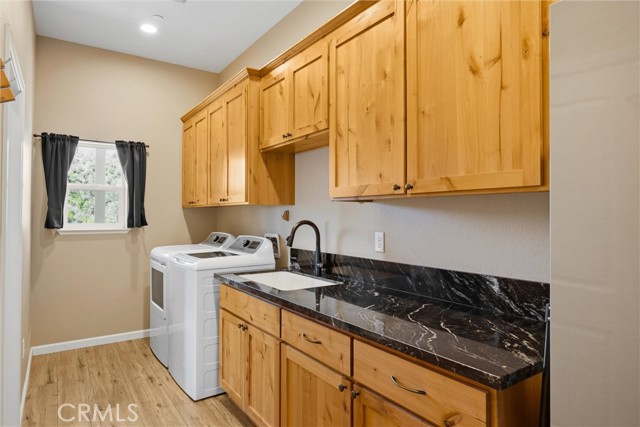 The KITCHEN has custom cabinets & granite countertops. MASTER SUITE has an en-suite bath with a soaking tub with a view of the lake. Shower glass is 1” Art Deco etched glass from Santa Monica. The walk-in closet has convenient, direct access to the LAUNDRY ROOM with lots of custom cabinetry for storage! There are TWO additional BEDROOMs. Look closely, & you'll find an additional cozy BONUS ROOM with a built-in desk, bookshelves, & cabinets.