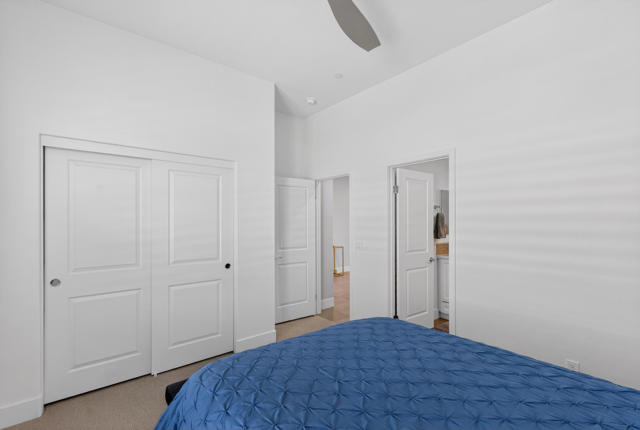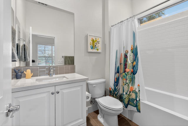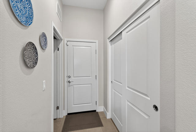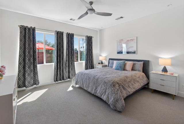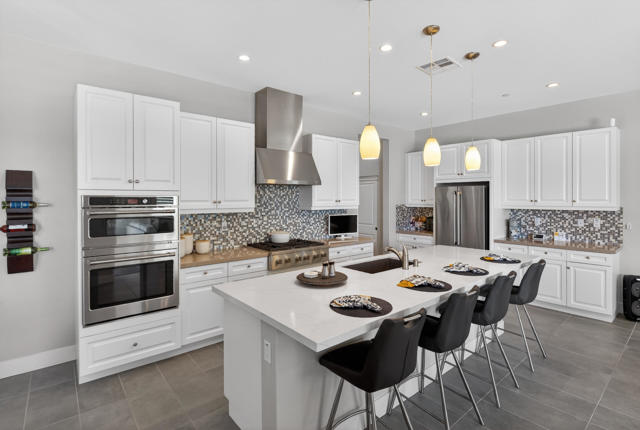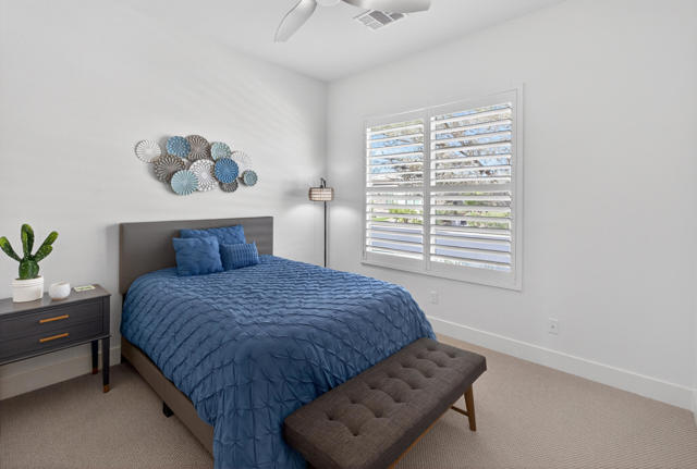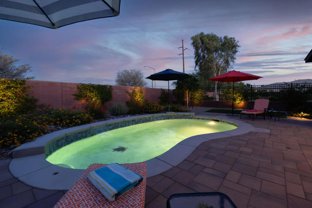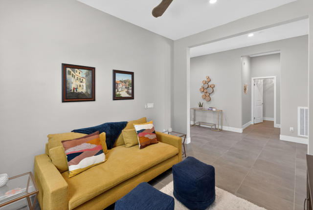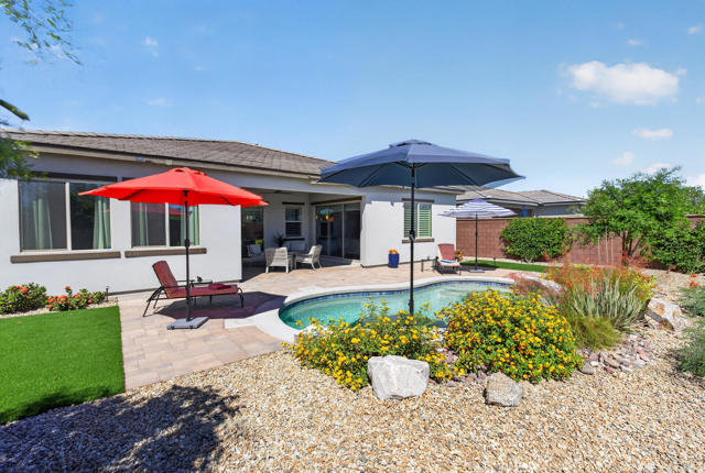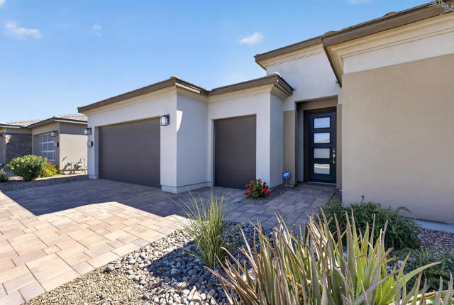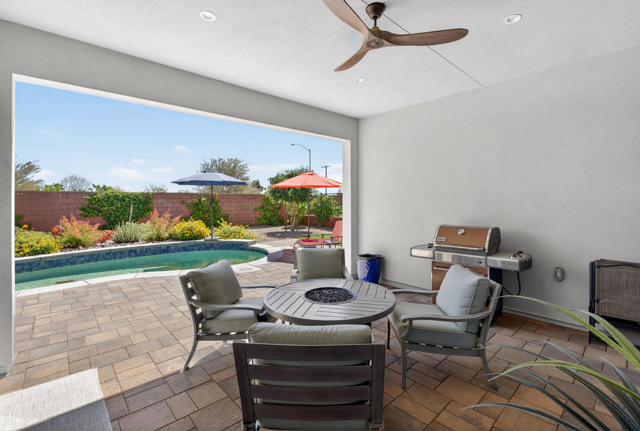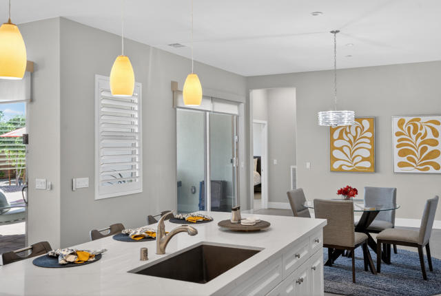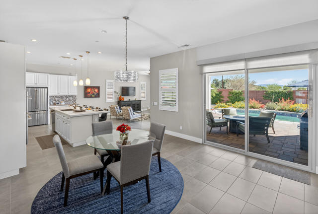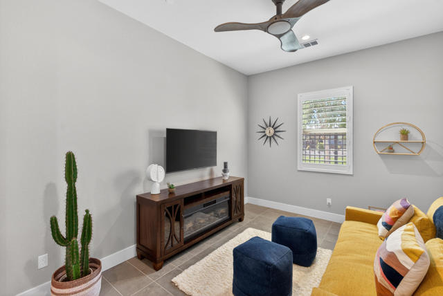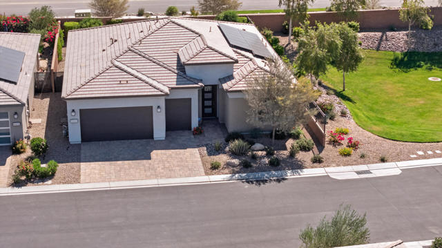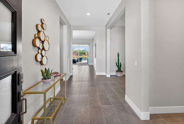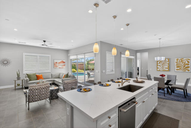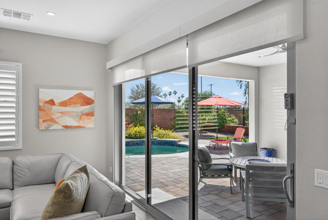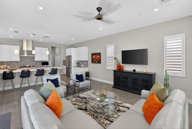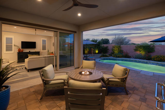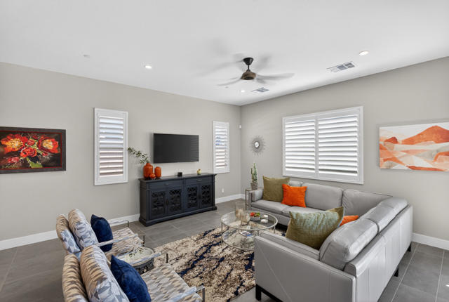 Welcome to elevated desert living in this stunning 'Excite' floorplan, ideally situated in the premier 55+ community of Trilogy Polo Club.Set on a private lot adjacent to a wide-open greenbelt with no rear neighbors and only one side neighbor, this gorgeous home built by Shea Homes in 2021 offers 2 bedrooms, 2.5 bathrooms, and a versatile den that is perfect for a home office, additional guest space, or optional third bedroom.Loaded with designer upgrades, the home features plank tile flooring, 5.25'' baseboards, a modern Therma-Tru Pulse front door, and custom finishes throughout. The expansive great room opens seamlessly to the backyard through a triple-panel sliding glass door, creating effortless indoor-outdoor living. Favorable sun exposure provides early afternoon shade, allowing the outdoor space to remain comfortable and usable even on warm desert days.The chef's kitchen is both functional and beautifully appointed, featuring GE Cafe Series stainless steel appliances, a 6-burner gas cooktop, quartz countertops, soft-close cabinetry, and a spacious island with pendant lighting ideal for everyday living and entertaining.The primary suite offers a peaceful retreat with a floor-to-ceiling tiled, frameless glass shower and dual quartz vanities. Guests enjoy their own private en-suite, making it easy to host. Step outside to a resort-style backyard complete with a pool and CHILLER - perfect for staying cool through the summer months. Unlike many homes in the community, this lot offers unobstructed rear views so instead of looking out at another rooftop, you'll enjoy mountains, palm trees, and a greater sense of space. Additional highlights include a laundry room with sink, a leased 15-panel solar system keeping electric bills low, and a climate-controlled garage.Residents of Trilogy Polo Club enjoy a highly social, easy-to-plug-into lifestyle with scenic walking paths and access to resort-style amenities, including the clubhouse, fitness center, resort and lap pools, pickleball and tennis courts, golf simulator, social clubs, and the on-site restaurant, June Hill's Table. Conveniently located just minutes from shopping, dining, and everyday essentials in La Quinta or Indio, the community offers both connection and convenience.This home presents a rare opportunity to own a thoughtfully upgraded, move-in-ready residence in one of the desert's most sought-after active adult communities.