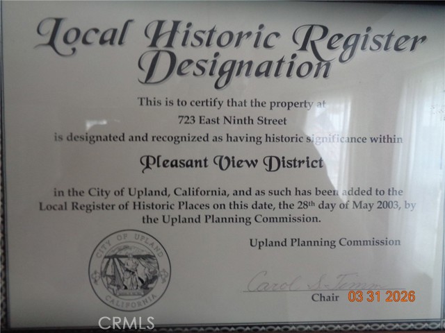 Step back in time and enjoy the charm of a simpler era in this single-story Upland home, set along tree-lined streets with classic picket fence appeal. With historical designation, this 3-bedroom, 1-bath residence showcases original architectural details, including built-in niches and cabinetry. The living room features a gas fireplace, while the spacious dining area is ideal for gatherings. A large family room sits adjacent to the kitchen, which retains its original character and includes an additional dining space. Bedrooms are generously sized, each with ceiling fans and abundant natural light. The home includes indoor laundry with a 220-amp hookup, gas floor heating, and no air conditioning—preserving its vintage authenticity. A private drive-through driveway offers convenient front-to-rear access. The property also features RV parking, a detached two-car garage, and a separate carport, providing flexible use options. The backyard offers exceptional privacy, with a grassy area, large planters, and a built-in BBQ station—perfect for outdoor enjoyment. Award winning Upland schools are nearby. Shopping and world class Upland parks and recreation opportunities abound. The newer roof will give you a head start as you claim your very own piece of the American Dream in beautiful Upland California!