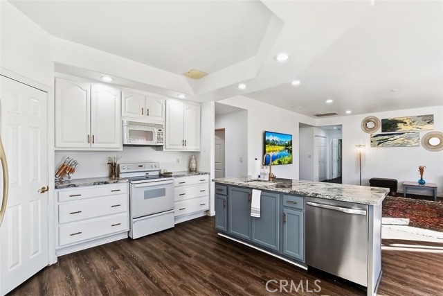 The interior includes furnishings in the living room, dining area, and bedrooms. Kitchen and bathrooms have been updated with modern finishes. Additional features include a 2-car garage and in-unit washer and dryer.