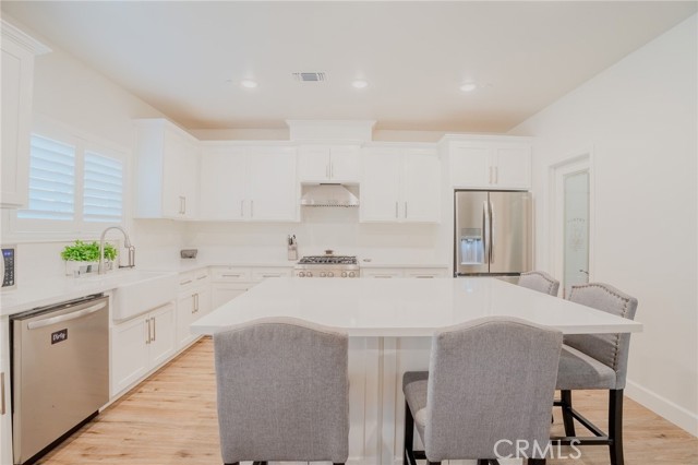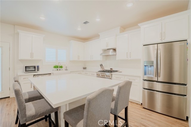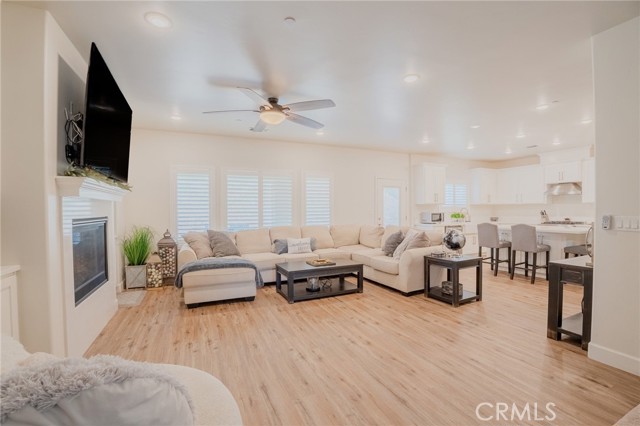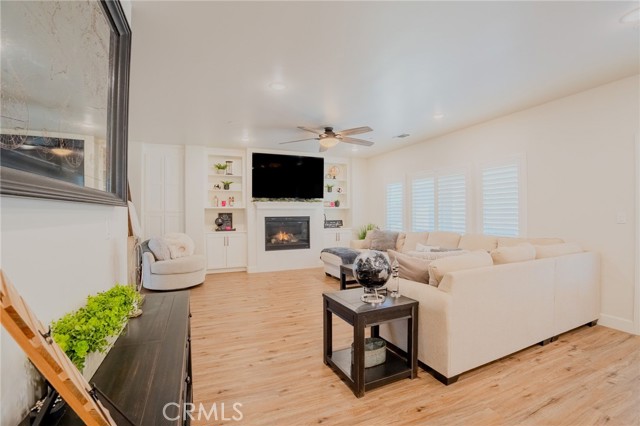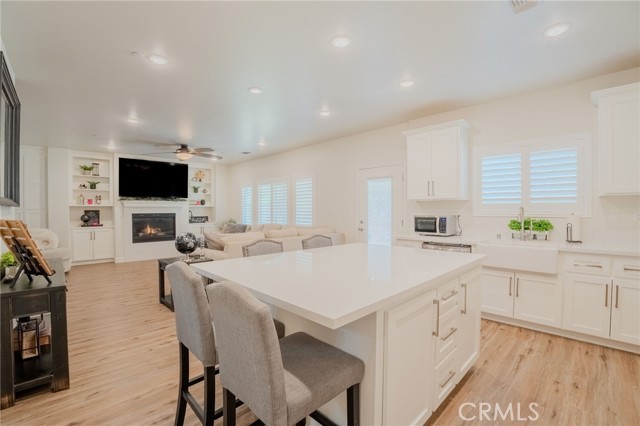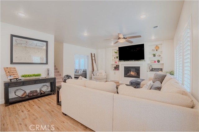 The heart of the home is the inviting living room, featuring custom built-in shelving and a cozy gas fireplace. The chef’s kitchen is a standout, showcasing a large quartz island, abundant counter space, and a spacious pantry designed for convenience and style.