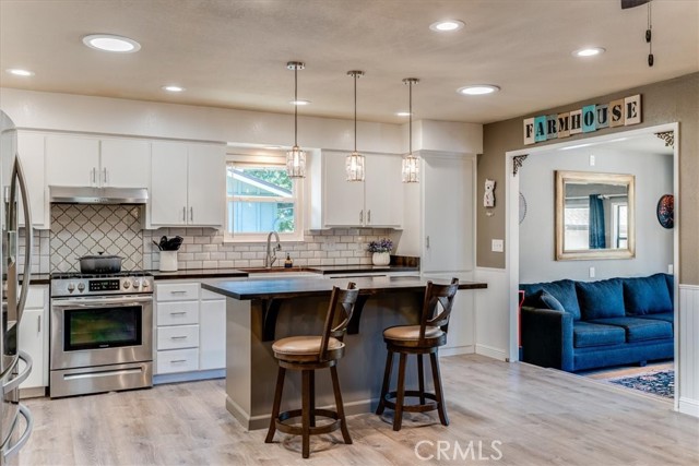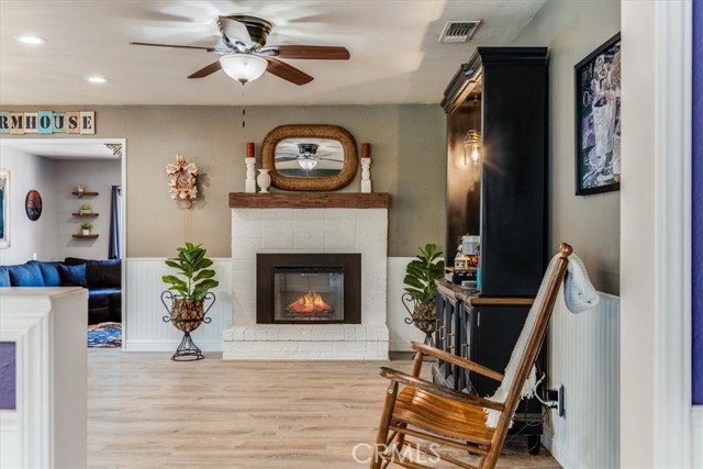 The inviting kitchen blends style and function with classic subway tile backsplash, butcher block countertops, and a center island that adds prep space and a natural gathering spot. The kitchen opens to an additional dining area anchored by a cozy electric fireplace and coffee bar.