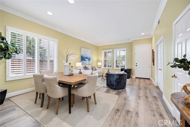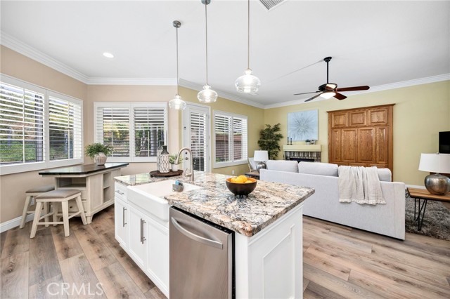 Inside, you’ll immediately notice the soaring 10-foot ceilings and abundance of natural light, enhanced by plantation shutters throughout. The home has been thoughtfully updated with new vinyl plank flooring, fresh interior paint, updated baseboards and casings, and a remodeled kitchen that anchors the main living space.