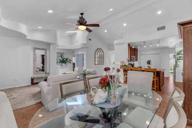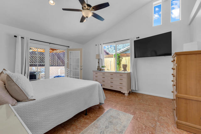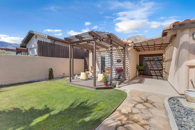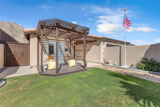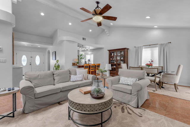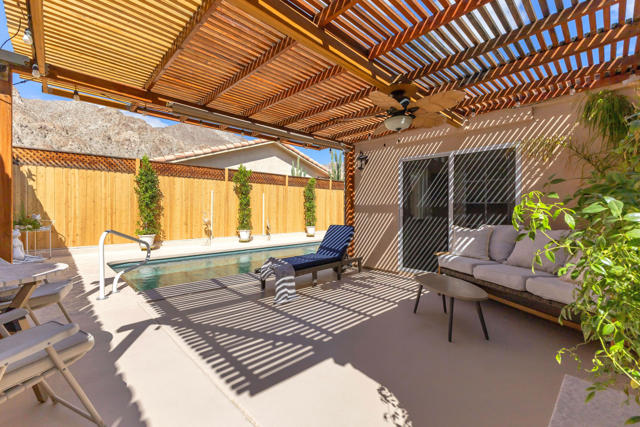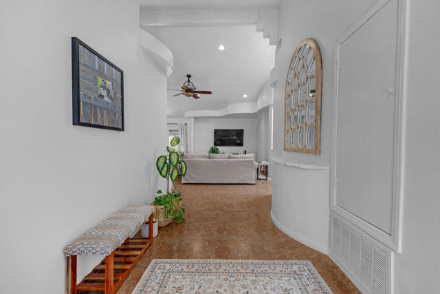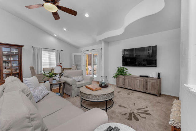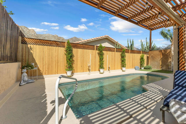 Welcome to upper La Quinta Cove, where peaceful living, mountain views, and true desert lifestyle come together in one beautifully designed home.From the moment you arrive, the difference is clear. Double entry doors open into a defined foyer, creating a warm and inviting first impression rarely found at this price point. Inside, soaring ceilings and abundant natural light make the home feel expansive well beyond its approximately 1,800 square feet.Designed with both everyday living and entertaining in mind, the layout flows effortlessly from the kitchen to the dining area and out to the backyard patio and pool. Whether hosting friends or enjoying a quiet evening, the indoor outdoor connection feels seamless and natural.The primary suite offers a private retreat with French doors opening directly to the backyard, perfect for morning coffee or evening relaxation. Guest accommodations are thoughtfully designed with a Jack and Jill bathroom connecting two bedrooms, while an additional powder bath provides convenience and privacy for visitors.What truly sets this home apart is its dual outdoor living experience. The private backyard features a pool and covered patio ideal for entertaining, while the enclosed front courtyard offers a serene escape with fountain ambiance and stunning sunrise views over the Santa Rosa Mountains. Both spaces create a rare sense of privacy and tranquility.Located in the highly desirable upper Cove, this home enjoys exceptional quiet and a true neighborhood feel, where neighbors connect and look out for one another. Just moments away, you will find scenic hiking and biking trails, along with the charm, dining, and shopping of Old Town La Quinta.This is more than a home. It is a lifestyle defined by light, privacy, flow, and connection to everything that makes La Quinta special.