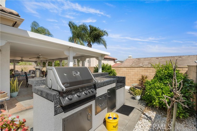 Enjoy a beautifully landscaped backyard featuring a covered patio with a solid roof and a custom BBQ island, perfect for relaxing or entertaining, surrounded by flowers and mature fruit trees.