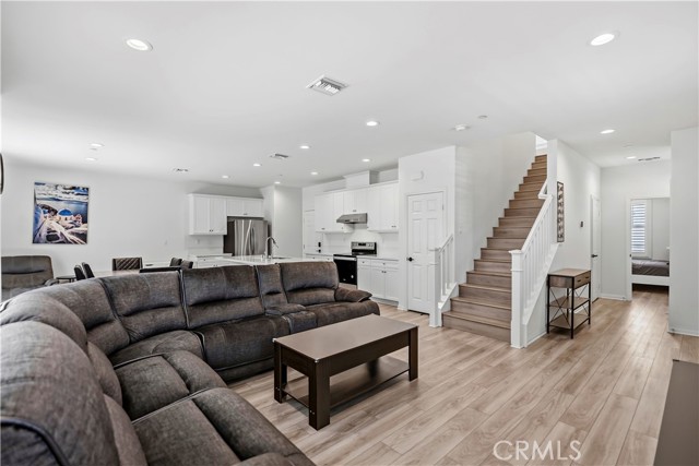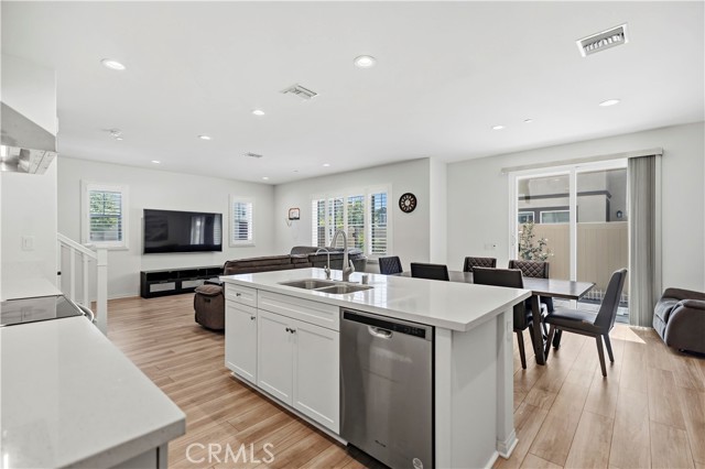 The open-concept layout seamlessly connects the kitchen, dining, and living areas, creating a bright and inviting space. The kitchen features shaker-style cabinetry, quartz countertops, a center island, and stainless steel appliances. From the dining area, dual sliding glass doors lead to a private side yard—ideal for outdoor seating, entertaining, or everyday enjoyment.