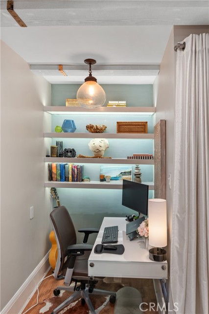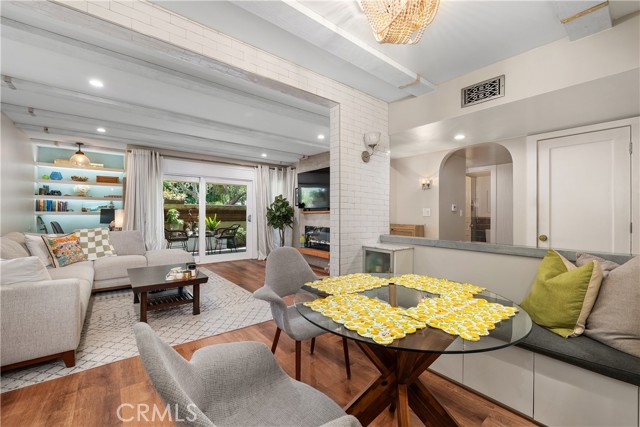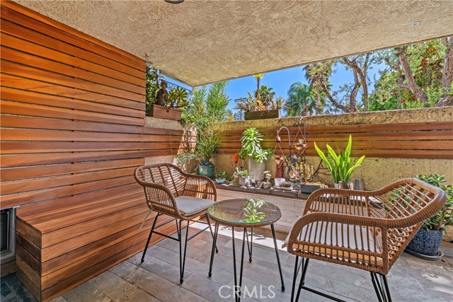 This stunning and sophisticated condo is located in prime Valley Village, offers the feel of a house with incredible design elements and well appointed features throughout. You are welcomed by a charming garden courtyard, flanked with stones, plants and a peaceful fountain. Upon entry you will immediately notice the decorator-finishes such as beam ceilings, wood-like vinyl floors (real ebony hardwood floors underneath) and recessed lighting. Continue into the open and bright living area with custom electric fireplace, home office nook with built-ins and double-pane slider that opens to the large patio-complete with zen-garden style and perfect for those early morning cappuccinos. The cook’s kitchen features custom cabinets, Carrera marble counters and large pantry. The dining area is highlighted by built in bench seating with storage and beautiful light fixture. Views of greenery from every window and no expense spared in the details! Notice the arched doorways, solid core doors and custom niches to display treasures. The oversized master suite features exposed concrete flooring, crown molding, a second custom fireplace, white washed brick accent wall and nice size closet with organizers. Large picture window overlooks the private garden patio. Remodeled spa-like bathroom features Carrera marble counters, a large shower with bench, rain shower head and travertine counters. The second spacious bedroom has large closet with custom designed organizers and crown moldings. It is adjacent to the guest bathroom, with custom cabinets and a large stone-floor shower with rain shower head. Other amenities include in-unit laundry hook-up, central air/heat, a sparkling pool, green space/gardens which is perfect for a dog run, two-car covered parking, and additional storage in the garage.