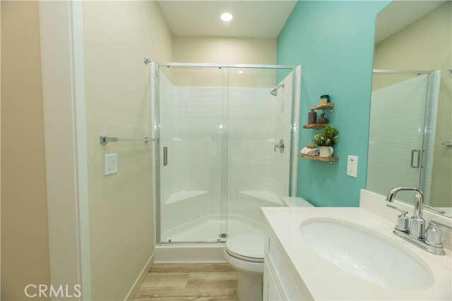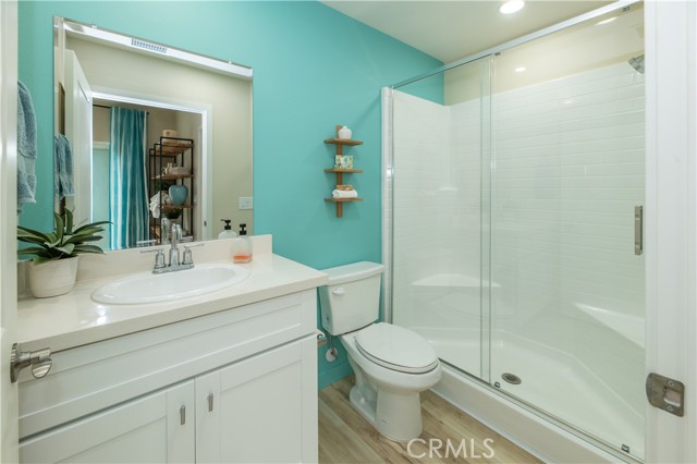 Interior finishes include luxury vinyl plank flooring throughout the main living areas and custom zebra blinds installed on all windows. A convenient downstairs bedroom with an adjacent full bathroom offers flexibility for guests, a home office, or shared living.