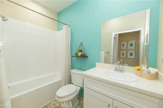 Interior finishes include luxury vinyl plank flooring throughout the main living areas and custom zebra blinds installed on all windows. A convenient downstairs bedroom with an adjacent full bathroom offers flexibility for guests, a home office, or shared living.