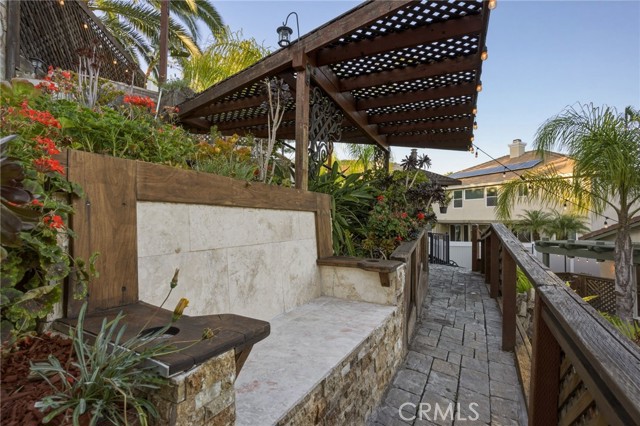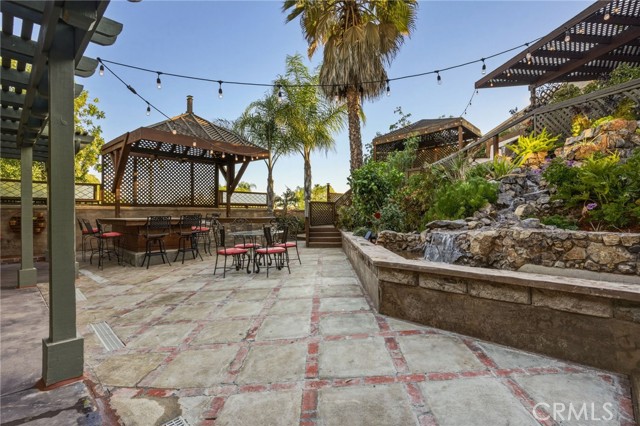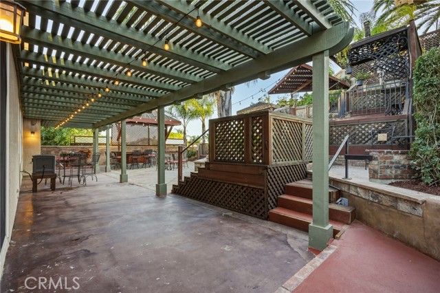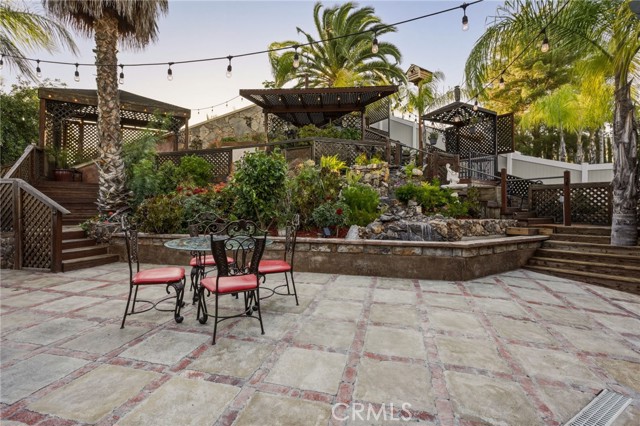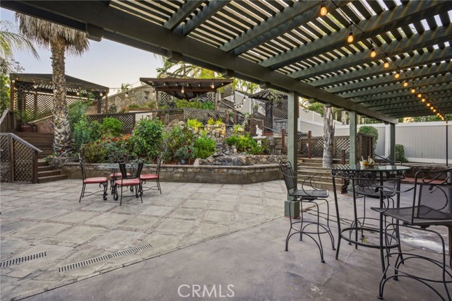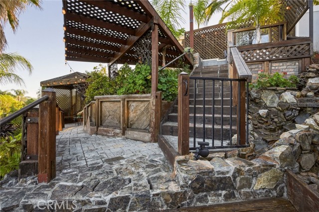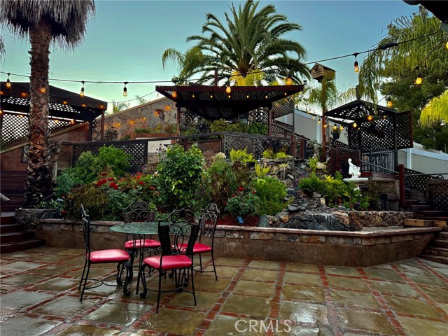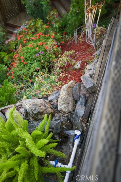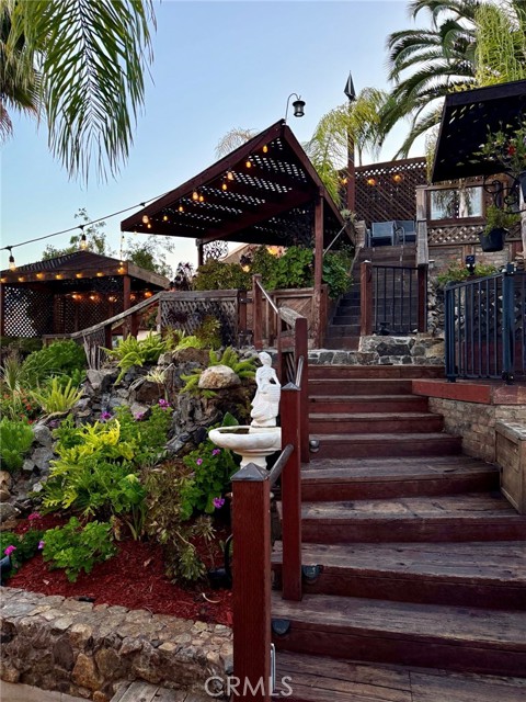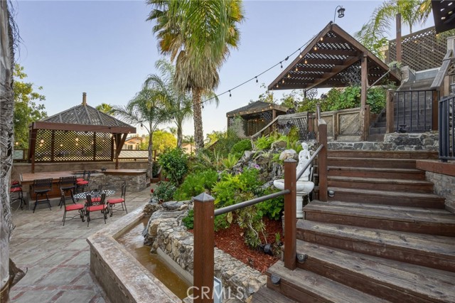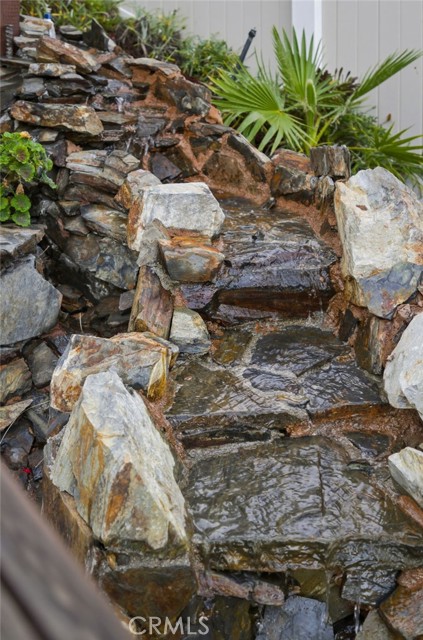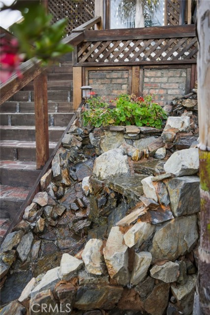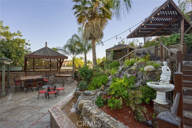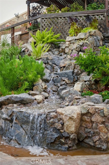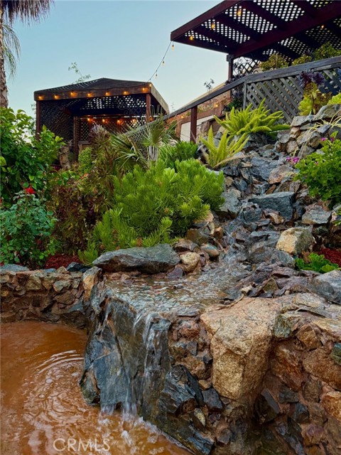 The exterior has been equally refined with smooth stucco, natural rock detailing on three feature walls and columns, elevated wood planters, and epoxy finishing on the driveway. The backyard is designed for entertaining with an oversized custom BBQ island, a natural rock waterfall installed in 2025 with switch-controlled operation, and a professionally crafted patio built with premium red oak, mahogany, walnut, and treated lumber. A dramatic rock slab anchors the upper landing, and mature landscaping creates a lush, inviting outdoor environment.