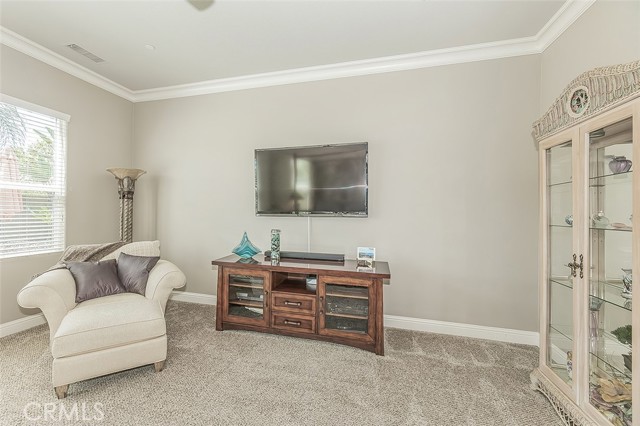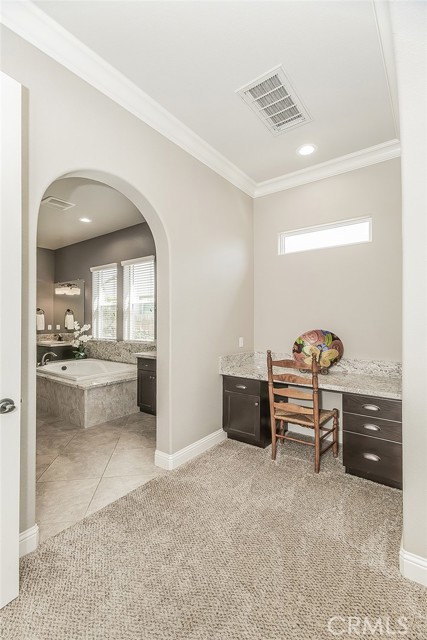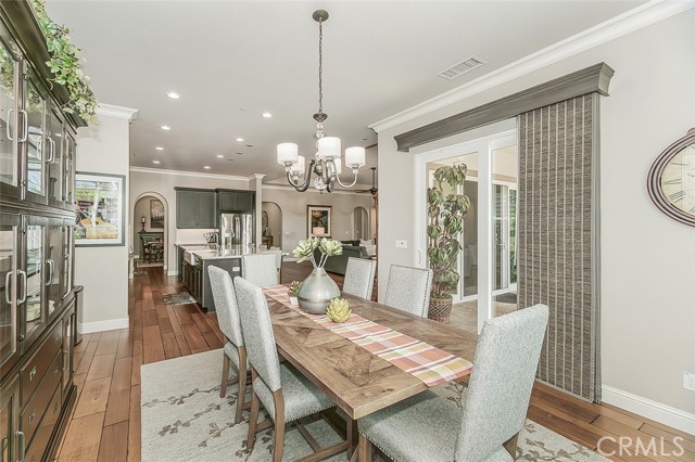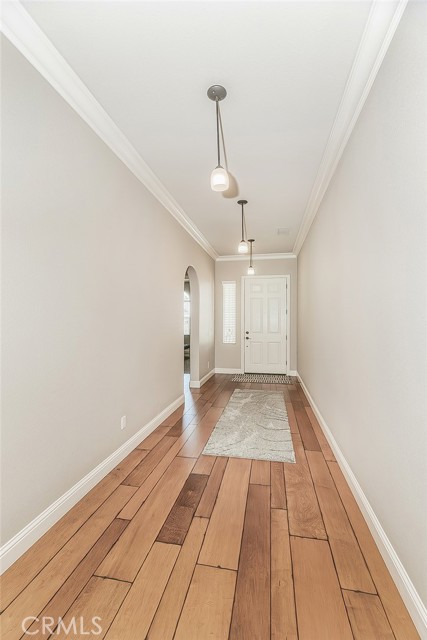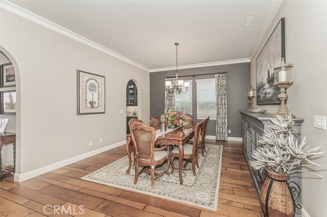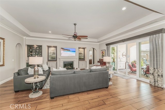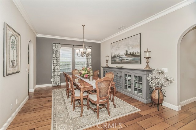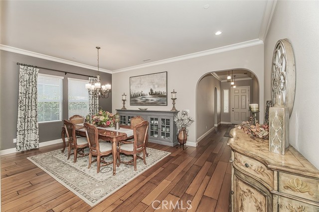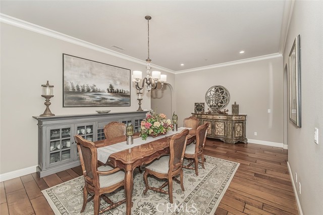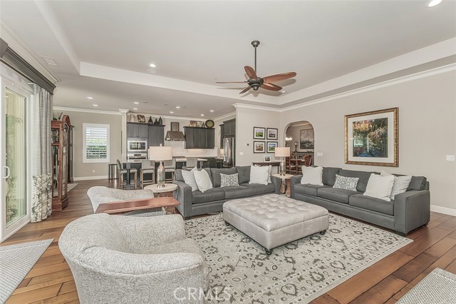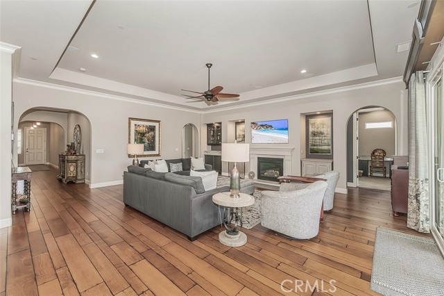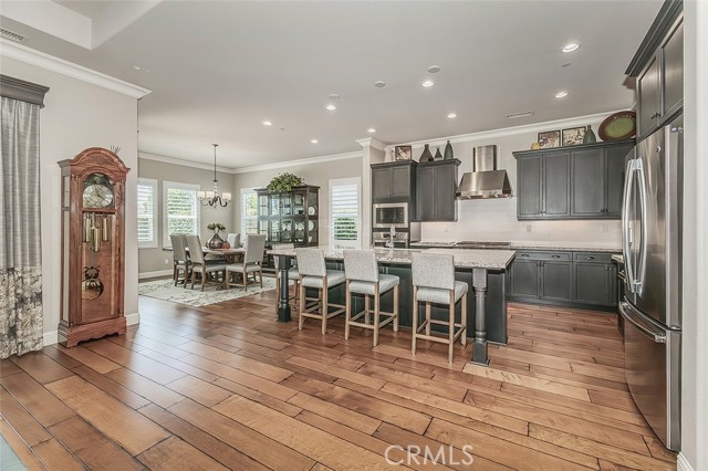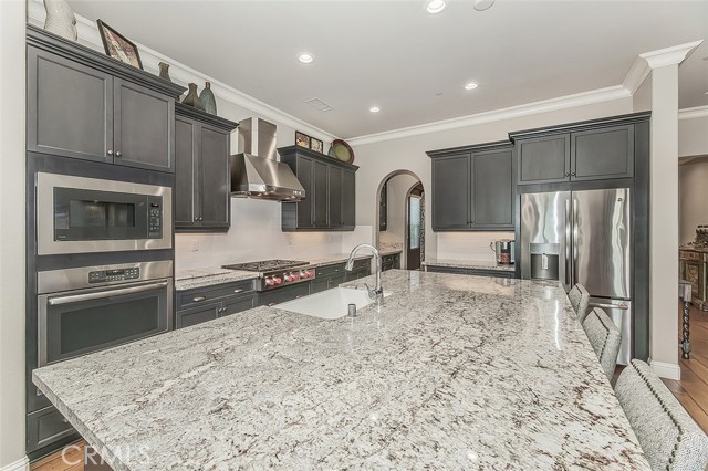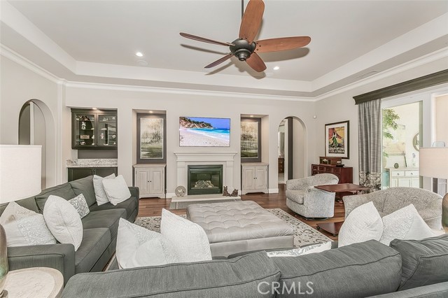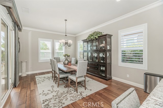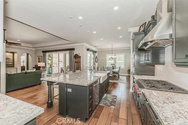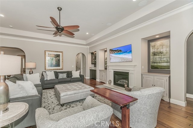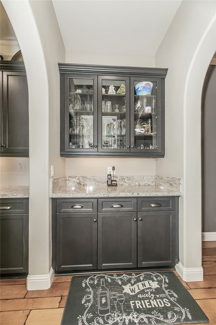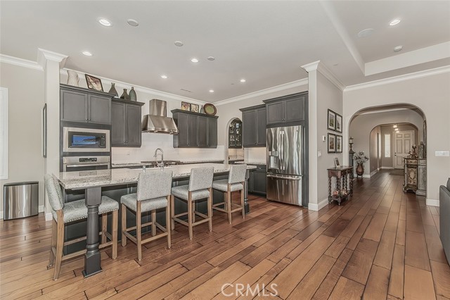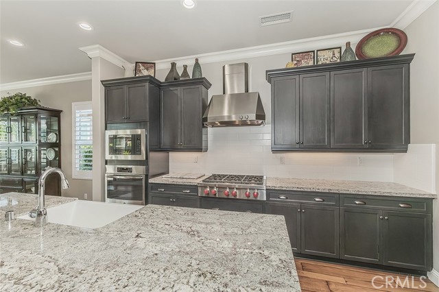 The interior features rich wood flooring throughout the main living areas, with tile flooring in the bathrooms for both style and durability. The kitchen is well-appointed with a Wolf gas cooktop, farm sink, Bosch dishwasher, Monogram exhaust hood, and GE Profile microwave and oven perfect for everyday living and hosting alike. The Great Room is equipped with surround sound system. Crown moulding in the Foyer Great Room-Kitchen-Dining Area, and Primary Bedroom . Upper cabinet and under-cabinet lighting.