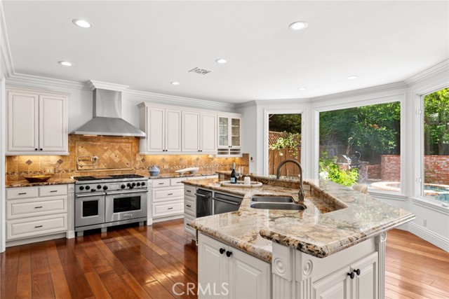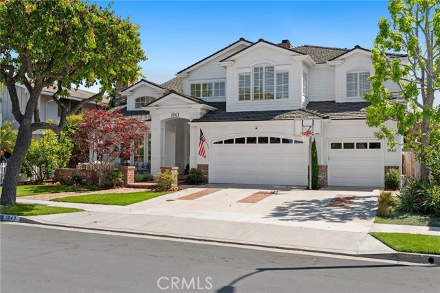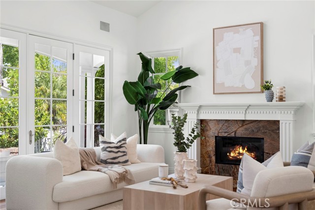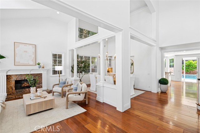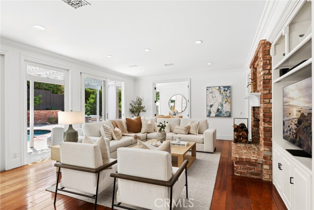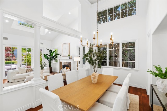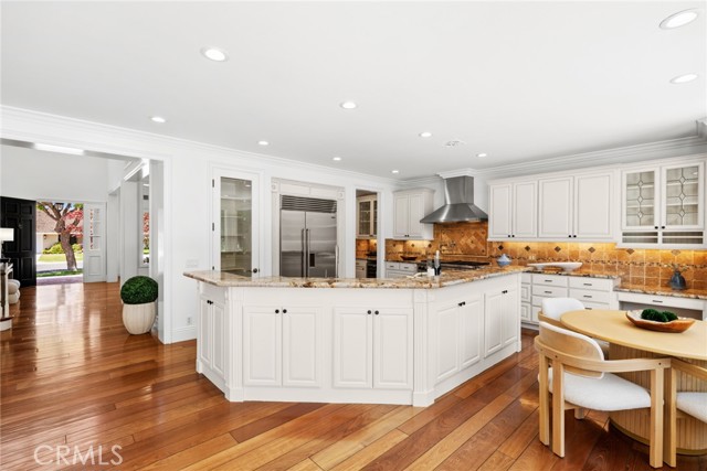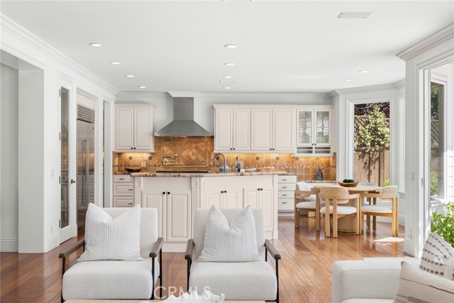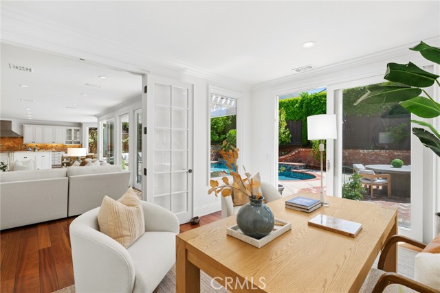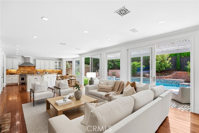 A welcoming front patio invites you into the formal living and dining rooms, offering a wonderful vantage point for morning coffee and greeting neighbors. The heart of the home lies in the open-concept family room and thoughtfully appointed chef's kitchen, which features premium stainless-steel Wolf and Sub-Zero appliances. Two sets of elegant French doors provide a seamless transition to the expansive entertainer’s backyard, complete with a private pool, spa, built-in BBQ, and ample space for outdoor dining and play.