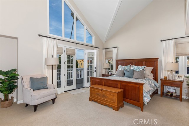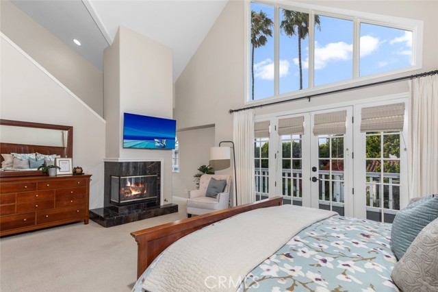 primary retreat with soaring ceilings, a cozy fireplace, French doors, and dramatic floor-