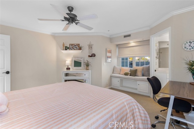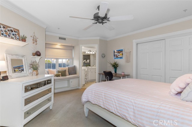 to-ceiling windows with palm tree and neighborhood views. Dual walk-in closets flank