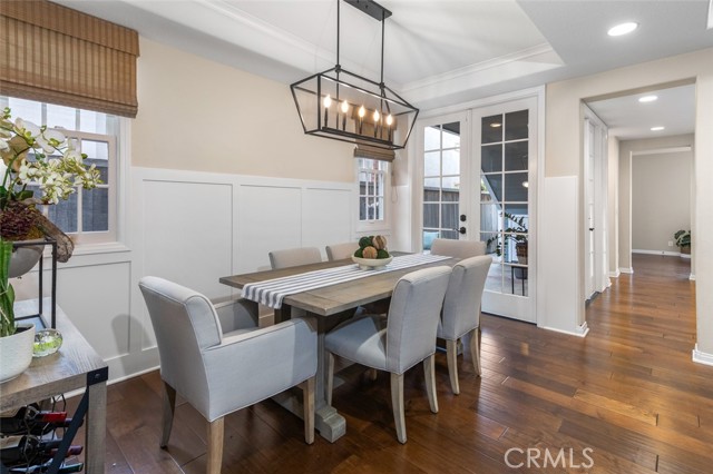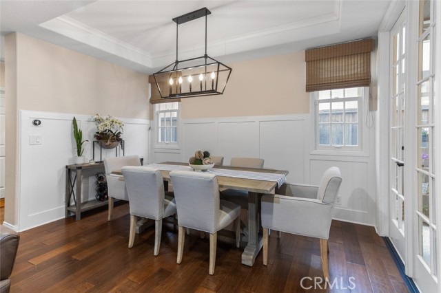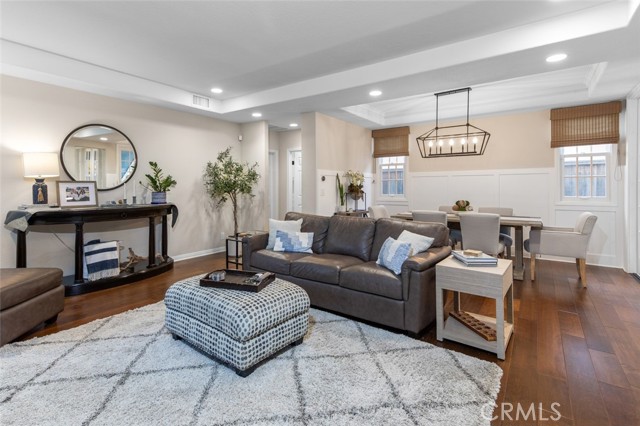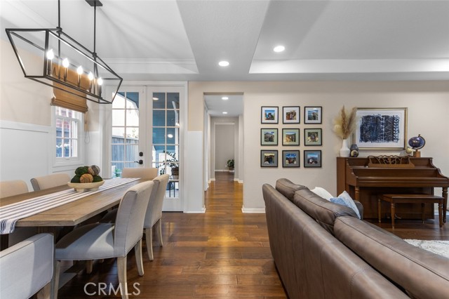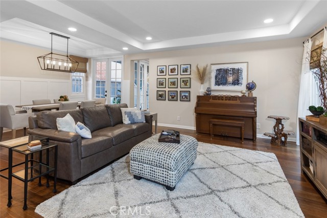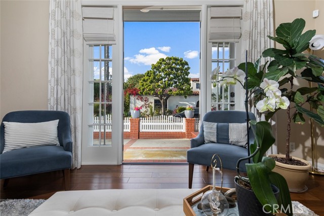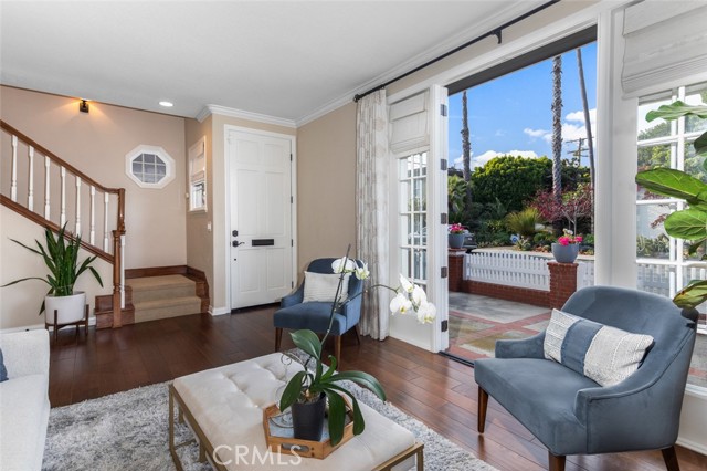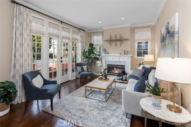 welcome you into a formal living room with an elegant fireplace and rich wood floors.