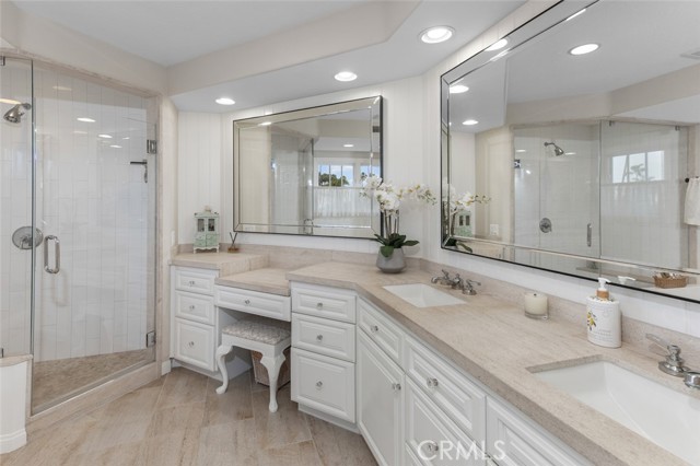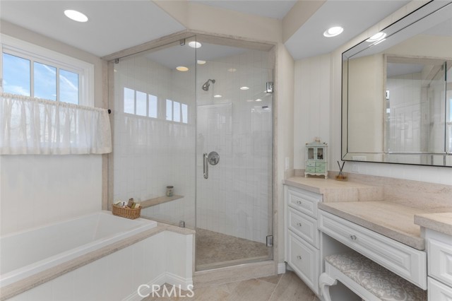 the spa-like bath with sumptuous limestone counters and floors, a glass-enclosed