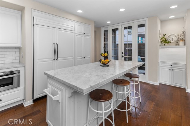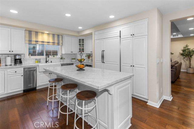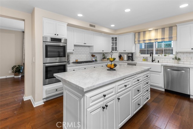 custom white cabinetry, stainless steel appliances, an oversized center island, and a