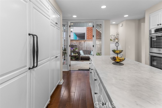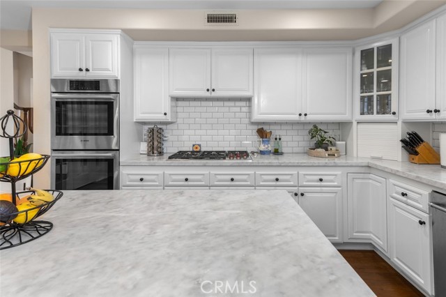 The upgraded kitchen features Carrara marble counters, subway tile backsplash,