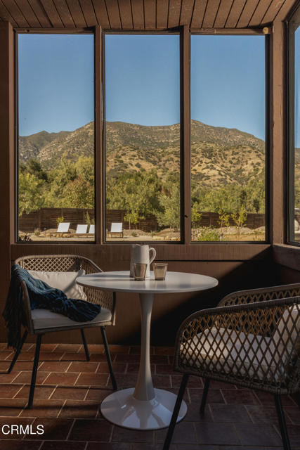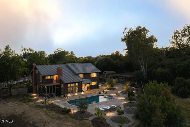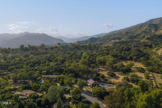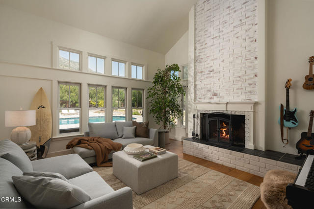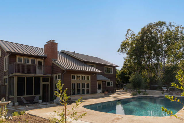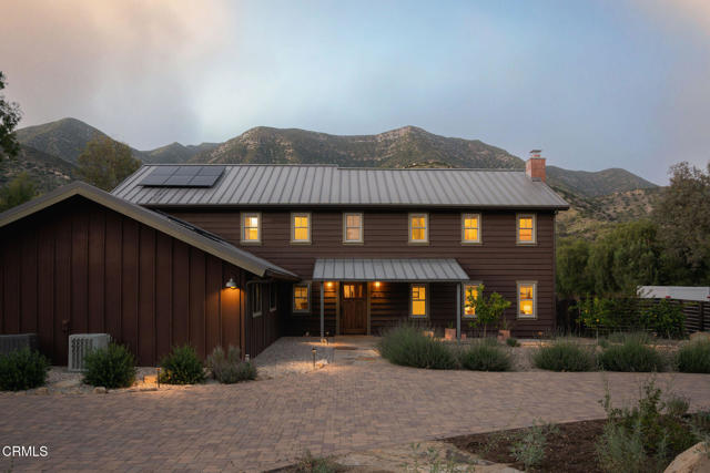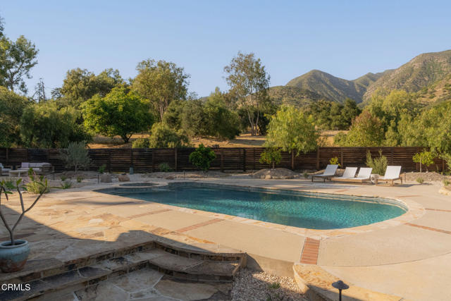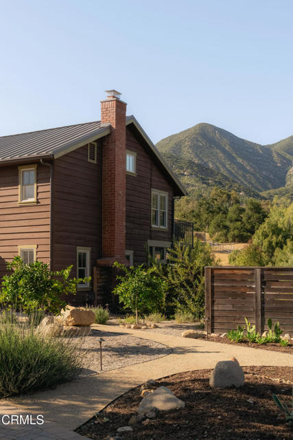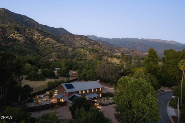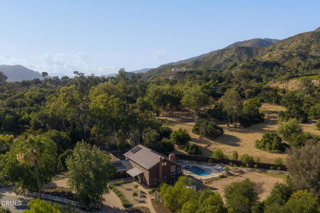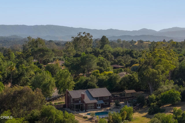 A timeless farmhouse sits on an acre of land against the mountains, where an unobstructed view, towering sycamores, and a profound sense of peace welcome you home. Designed by Ojai's beloved architect Zelma Wilson, craftsman details and farmhouse warmth anchor this handsome home at the top of the coveted Del Oro circle.Inside, a high-ceilinged foyer opens the home in every direction. Straight ahead, the formal living room is anchored by a magnificent, nearly two-story fireplace and connected to a gracious dining room. To the left, a chef's kitchen -- appointed with a Wolf range, Sub-Zero refrigerator, stone countertops, and walk-in pantry -- shares the space with an inviting family room. To the right, a spacious fifth bedroom offers maximal versatility on the main floor, complete with its own fireplace and screened porch. Upstairs, four ample bedrooms and a primary suite offer sweeping mountain views. Outside, the property has been transformed with intention. New flagstone hardscape and lavender-lined decomposed granite pathways wind through a landscape of California natives -- ceanothus, manzanita, sage varietals, and succulents. A veritable orchard rounds it all out, bearing Hass and Reed avocados, Meyer lemon, Australian finger lime, Cara Cara and blood oranges, Pixie mandarins, Ruby Red grapefruit, Black Mission figs, and Asian pear. Rooftop solar and two Tesla batteries provide an extra provide an extra layer of efficiency and security. Gazing toward the mountains, the pool and spa are an utterly romantic gathering place and the beginning of great things to come. The stone deck opens to an exceedingly usable, as yet undeveloped portion of the parcel -- ideally configured for a pool house, ADU, pickleball court, garden, barn, or all of the above. This exceptional home is fully appointed, and remains full of possibility.