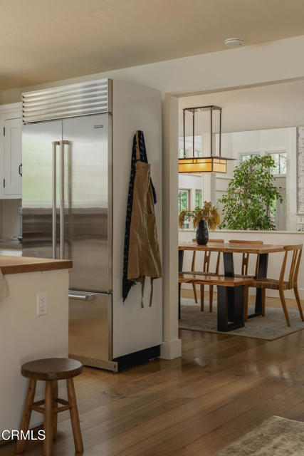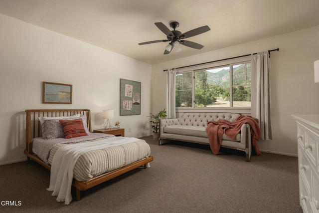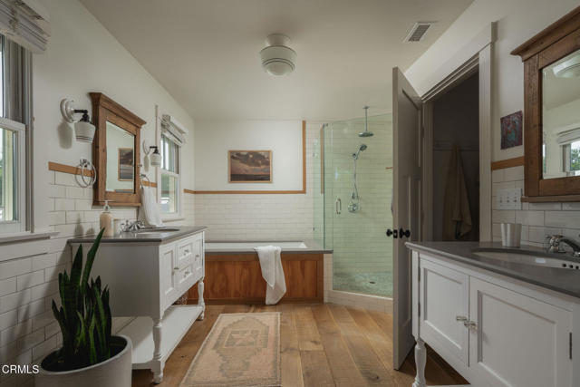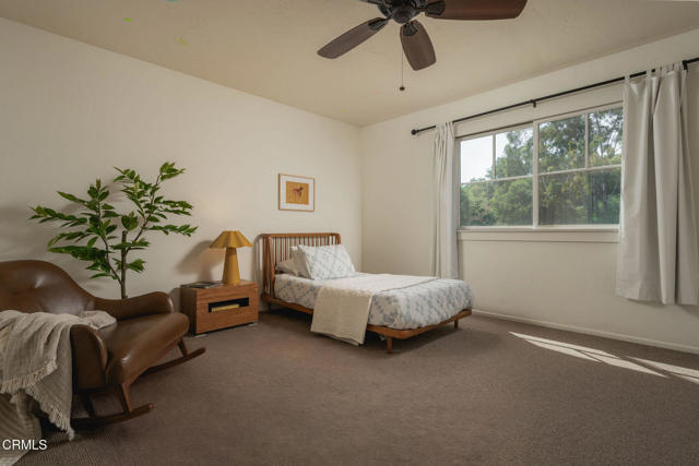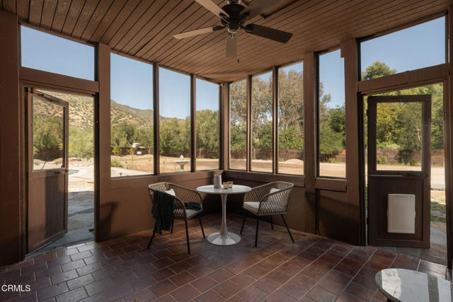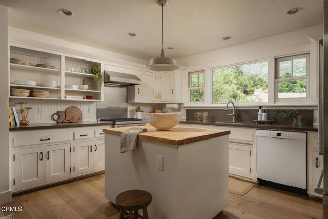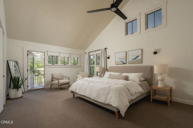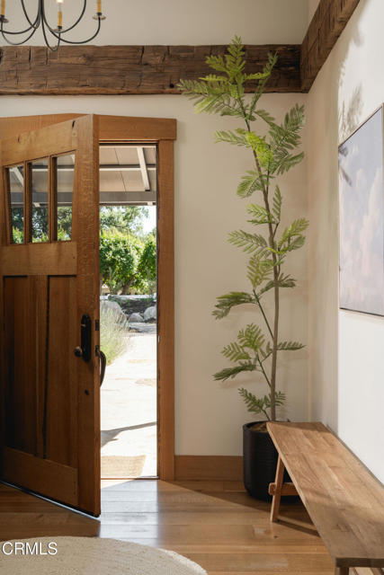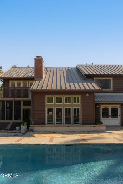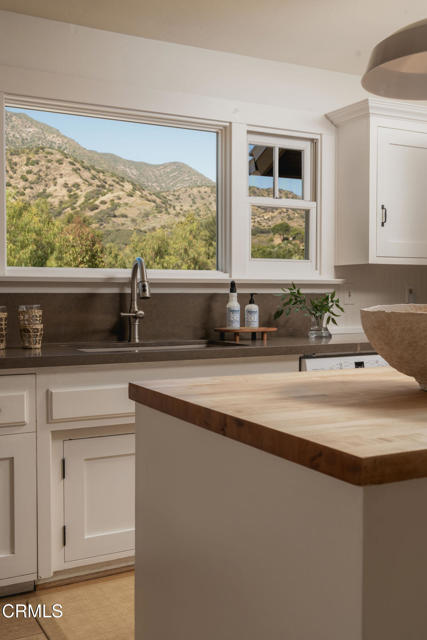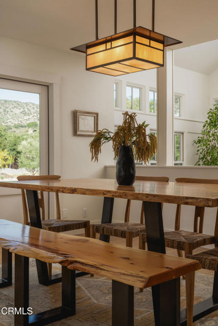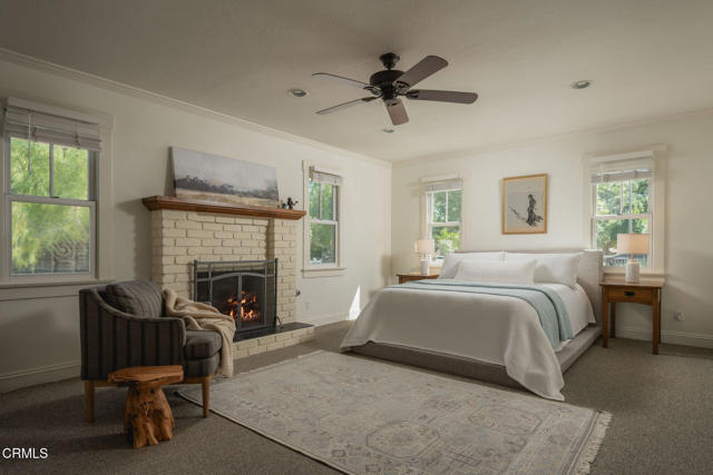 A timeless farmhouse sits on an acre of land against the mountains, where an unobstructed view, towering sycamores, and a profound sense of peace welcome you home. Designed by Ojai's beloved architect Zelma Wilson, craftsman details and farmhouse warmth anchor this handsome home at the top of the coveted Del Oro circle.Inside, a high-ceilinged foyer opens the home in every direction. Straight ahead, the formal living room is anchored by a magnificent, nearly two-story fireplace and connected to a gracious dining room. To the left, a chef's kitchen -- appointed with a Wolf range, Sub-Zero refrigerator, stone countertops, and walk-in pantry -- shares the space with an inviting family room. To the right, a spacious fifth bedroom offers maximal versatility on the main floor, complete with its own fireplace and screened porch. Upstairs, four ample bedrooms and a primary suite offer sweeping mountain views. Outside, the property has been transformed with intention. New flagstone hardscape and lavender-lined decomposed granite pathways wind through a landscape of California natives -- ceanothus, manzanita, sage varietals, and succulents. A veritable orchard rounds it all out, bearing Hass and Reed avocados, Meyer lemon, Australian finger lime, Cara Cara and blood oranges, Pixie mandarins, Ruby Red grapefruit, Black Mission figs, and Asian pear. Rooftop solar and two Tesla batteries provide an extra provide an extra layer of efficiency and security. Gazing toward the mountains, the pool and spa are an utterly romantic gathering place and the beginning of great things to come. The stone deck opens to an exceedingly usable, as yet undeveloped portion of the parcel -- ideally configured for a pool house, ADU, pickleball court, garden, barn, or all of the above. This exceptional home is fully appointed, and remains full of possibility.