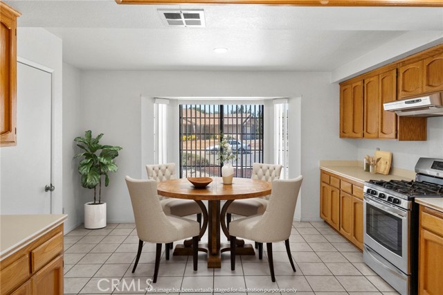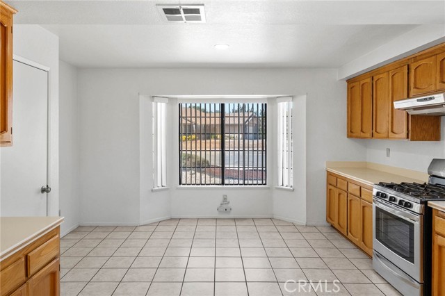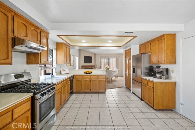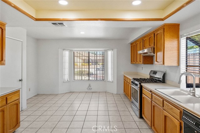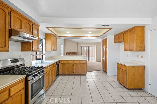 The spacious kitchen offers ample cabinetry, generous counter space, and a breakfast bar that opens to the main living area for easy everyday living.